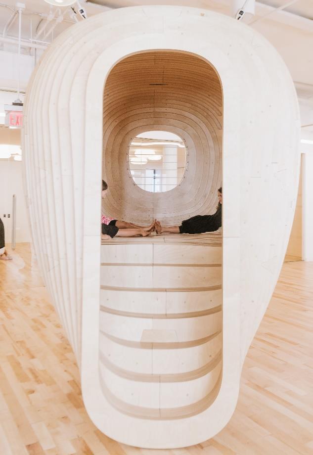 The color purple is stimulating and is contrasted with green which is restful. The cubbies allow for contemplation and privacy when needed. The trees in the background are a biophilic feature which display their pattern of fractals. Fractal patterns help connect us with nature on a biological level. The brain is predisposed to process them easily which lowers our stress response and helps to restore attention and decrease fatigue.