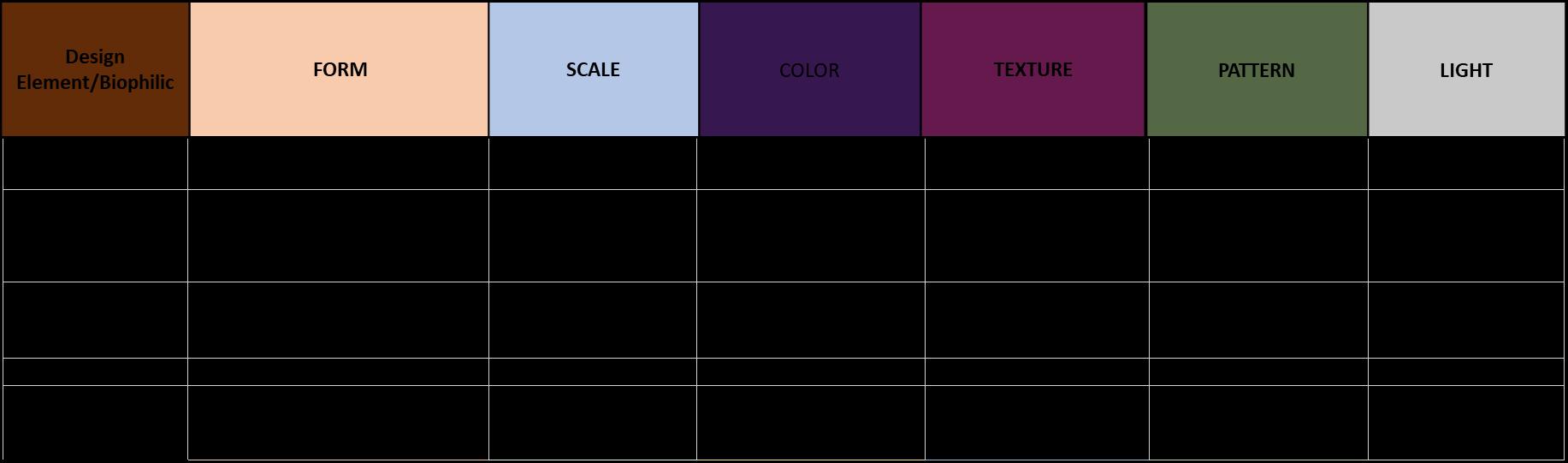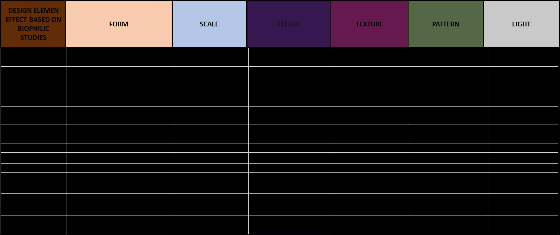 There were 35 studies selected for review and 25 were found relevant for this study. The six Biophilic design attributes that were used in this experience include: Form, Scale, Color, Texture, Pattern and Light. These studies were conducted within the school environment either in the classroom, in an outdoor setting on school grounds and in playscapes.