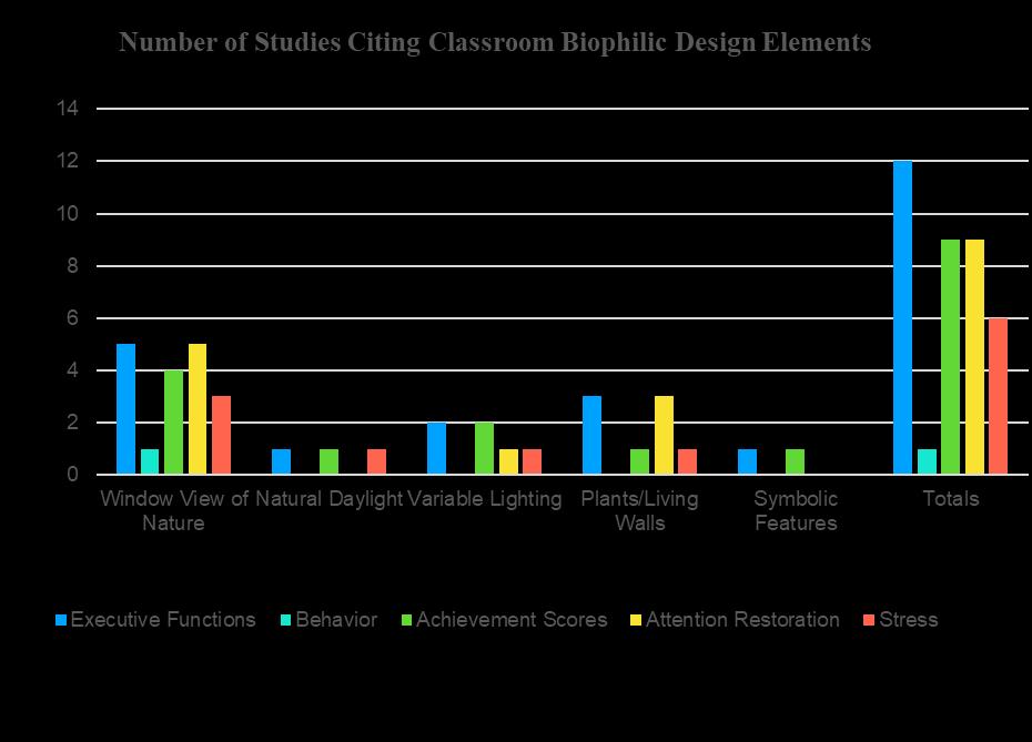 The studies were evenly divided between indoor and outdoor experiences: There were 14 studies reviewed that addressed the impact of Biophilic Elements on the executive functions compared to four for achievement scores.