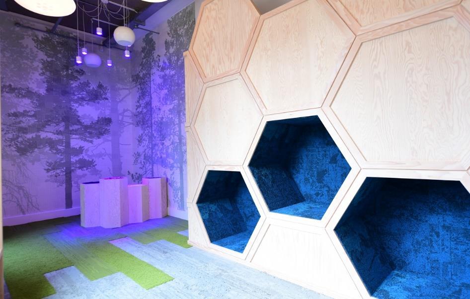 Each hexagon shaped cube is lined with Interface's Net Effect carpet, offering students an area of refuge. Photography courtesy of Interface.