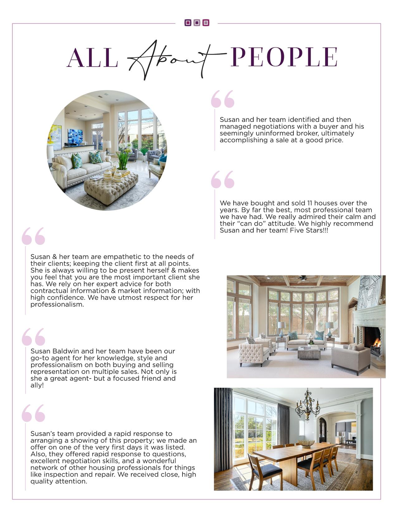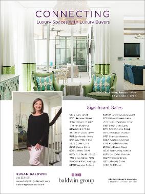 Two of Susan Baldwin?s most distinctive qualities include persistence and making people feel at ease Once you have met Susan and her team, you feel like you have friends for life Susan is decisive, forthcoming, and forceful, with a friendliness that provides her home buyers and sellers the utmost confidence Her energy and enthusiasm for helping clients is limitless She is a problem solver who uses her positive attitude to find common ground Finding properties off-market or before they hit the market has become a critical component of today?s market and Susan is well-positioned to search and find beautiful homes for her clients