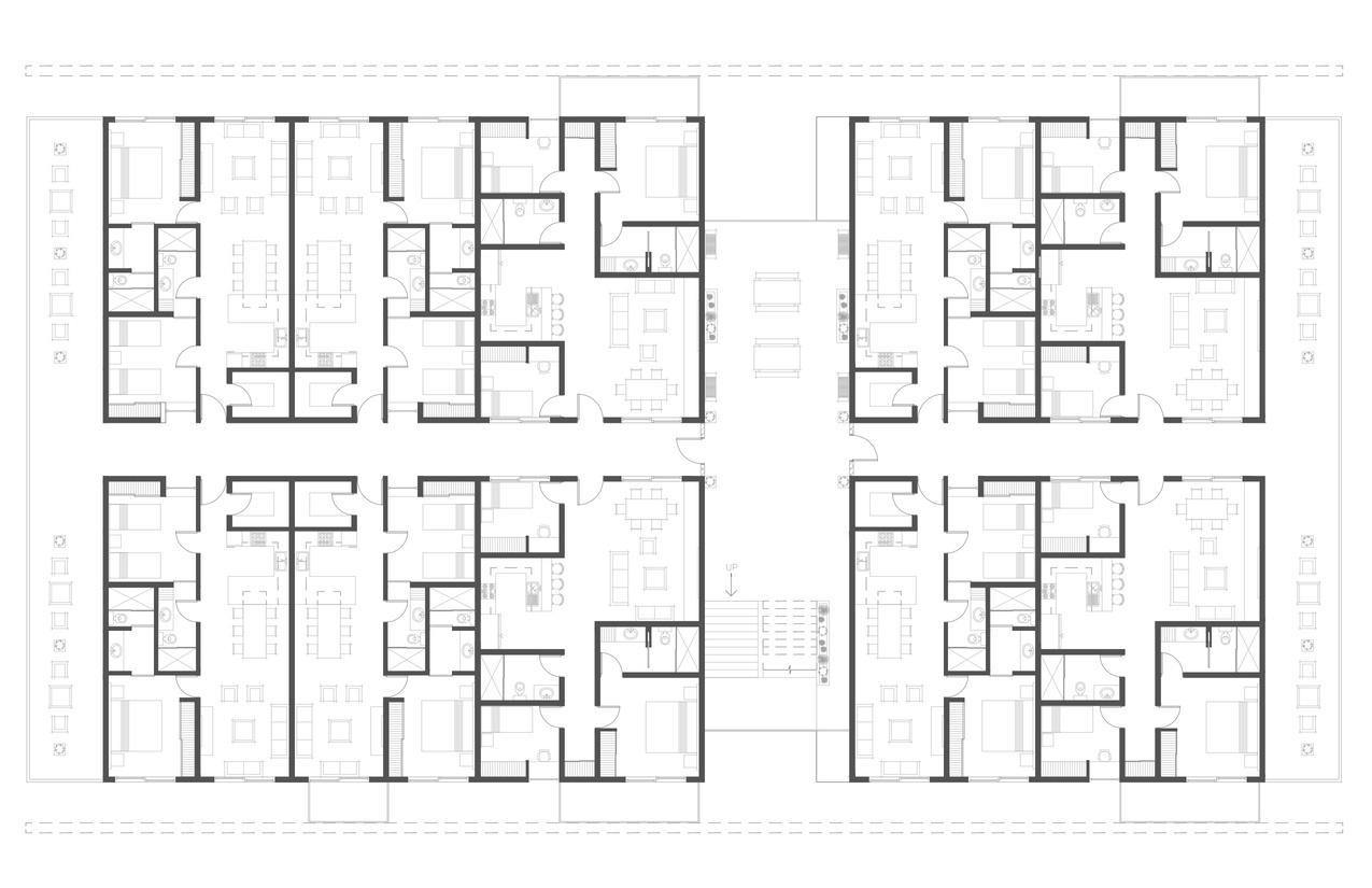 The 26 apartments include 3 different typologies. The first one is 72 square meters, meant to be for 1-2 people, all 6 of them are located on the ground floor to facilitate accessibility. The second typology is 90 square meters, it includes two full bathrooms and two bedrooms, meant to be for 2-4 people. There are 12 of these apartments distributed between level 1 and 2. Finally, the biggest typology is 108 square meters, it has three bedrooms, two bathrooms, living space and kitchen. It is meant for 3-5 people and there are 8 of these type of apartments. Located also between level 1 and 2.