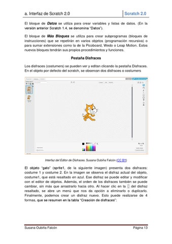 El bloque de Datos se utiliza para crear variables y listas de datos. (En la versión anterior Scratch 1.4, se denomina “Datos”). El bloque de Más Bloques se utiliza para crear subprogramas (bloques de instrucciones) que se repetirán en varios objetos (programación recursiva) o para sumar extensiones como la de la Picoboard, Wedo o Leap Motion. Estos nuevos bloques tendrán sus propios procedimientos y funciones. Pestaña Disfraces Los disfraces (costumers) se pueden ver y editan clicando la pestaña Disfraces. En el objeto por defecto del scratch, se observan dos disfraces o costumers