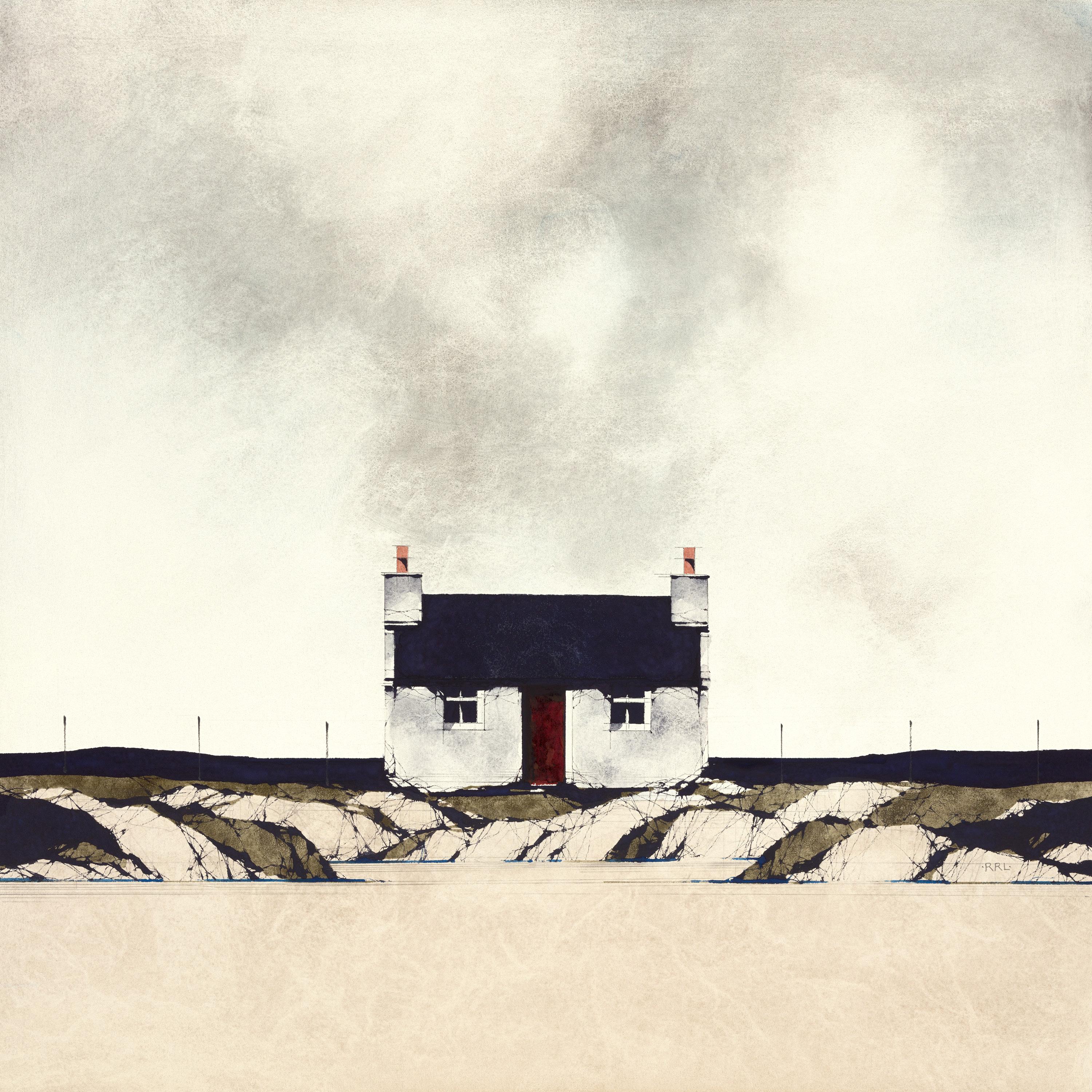 By the mid-1980s, Ron began developing what would become his signature grey skies, and by the 1990s, his focus had turned fully to the Scottish landscape. His now-iconic depictions of crofts and cottages set against vast, atmospheric skies emerged during this period, capturing the solitude and quiet majesty of Scotland’s western isles.
