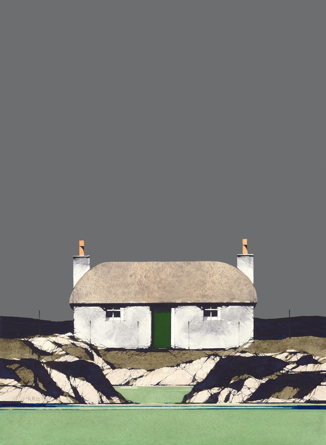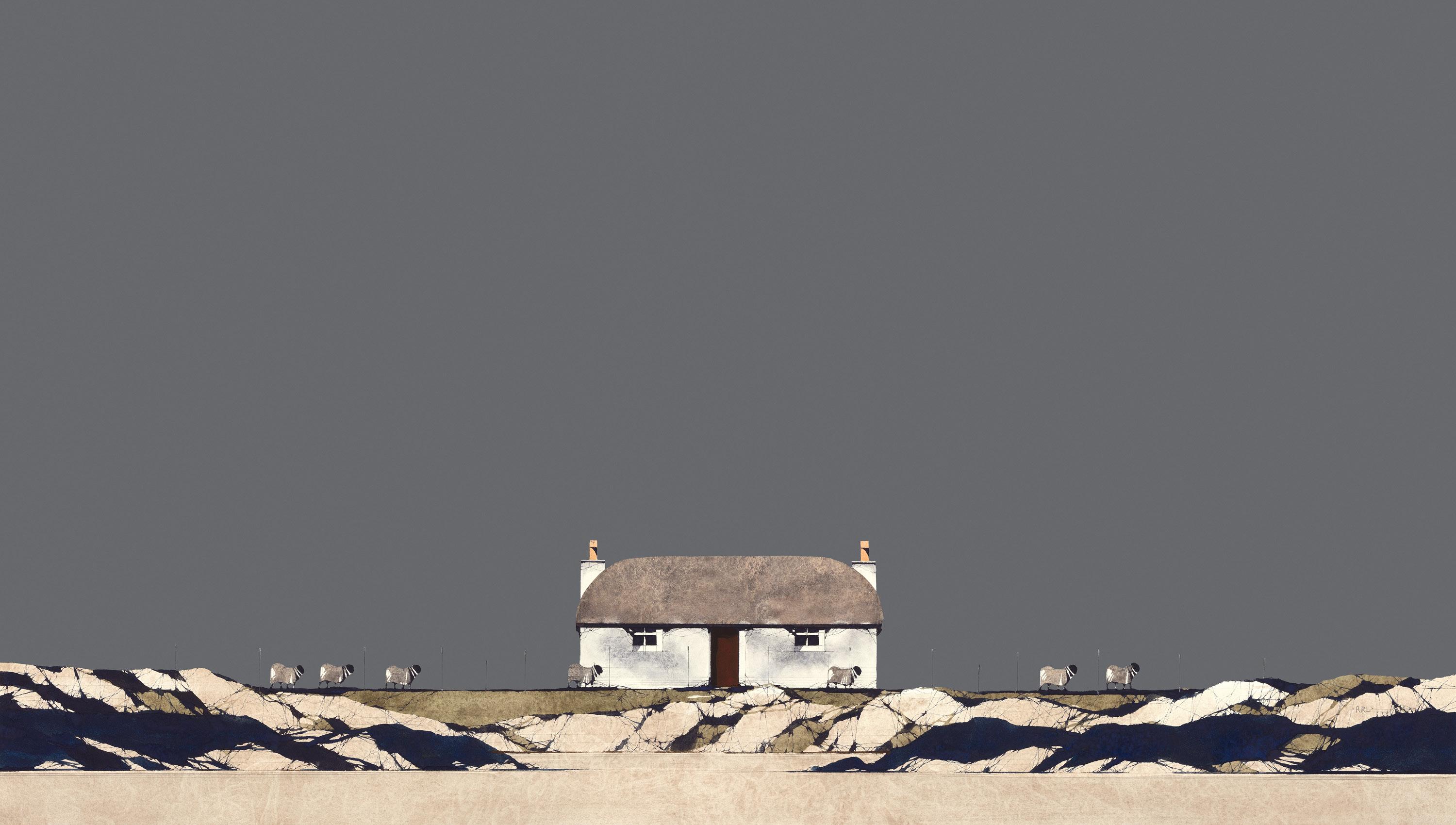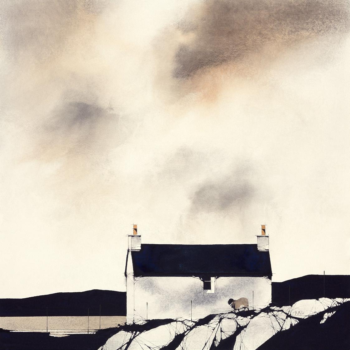 By the mid-1980s, Ron began developing what would become his signature grey skies, and by the 1990s, his focus had turned fully to the Scottish landscape. His now-iconic depictions of crofts and cottages set against vast, atmospheric skies emerged during this period, capturing the solitude and quiet majesty of Scotland’s western isles.
