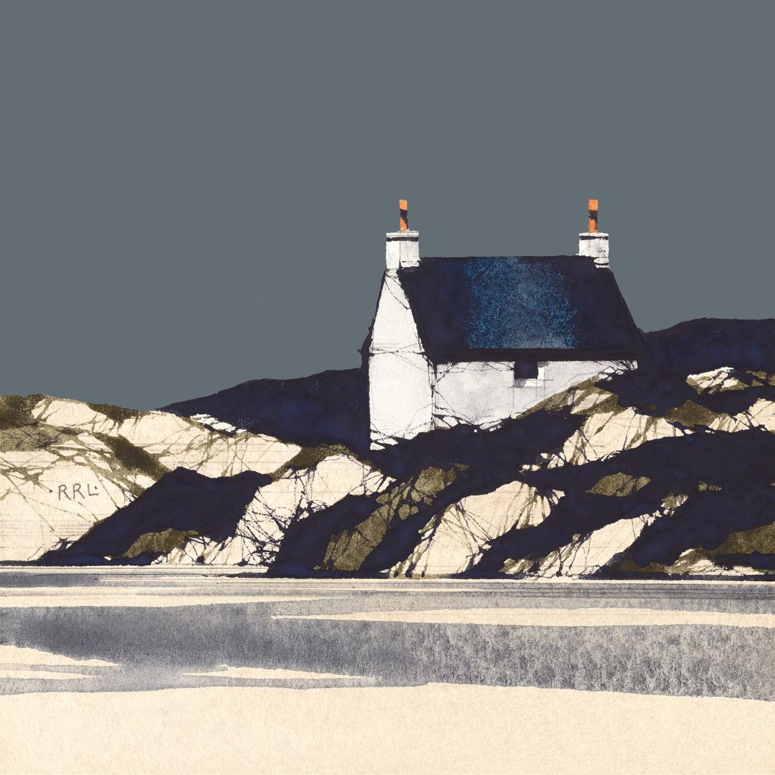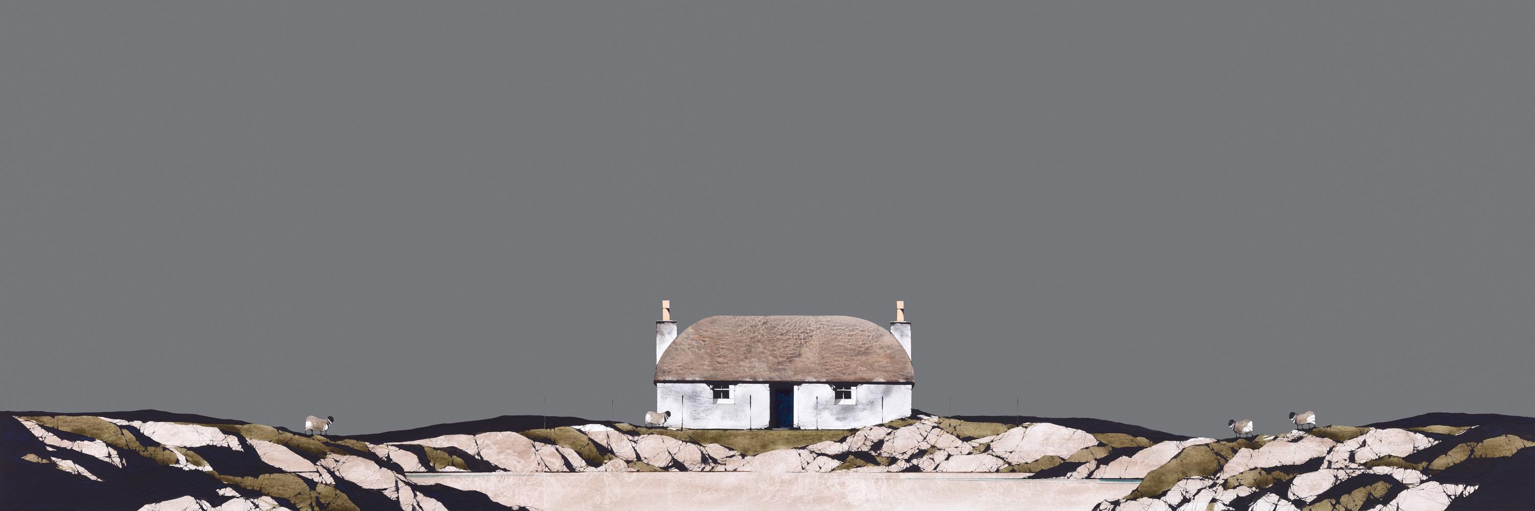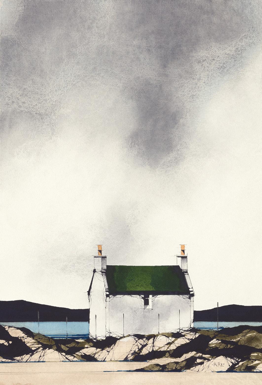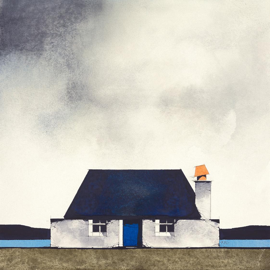 By the mid-1980s, Ron began developing what would become his signature grey skies, and by the 1990s, his focus had turned fully to the Scottish landscape. His now-iconic depictions of crofts and cottages set against vast, atmospheric skies emerged during this period, capturing the solitude and quiet majesty of Scotland’s western isles.
