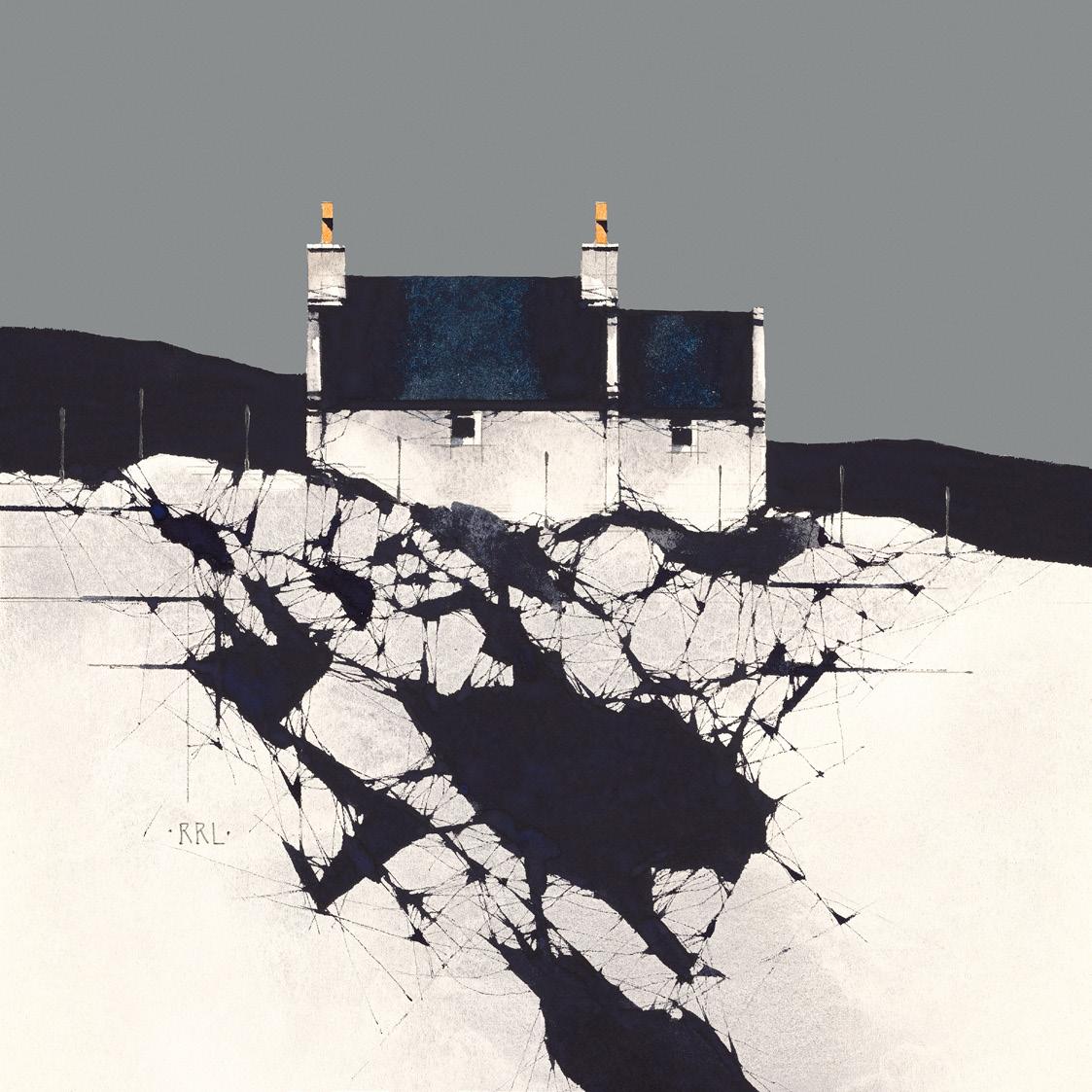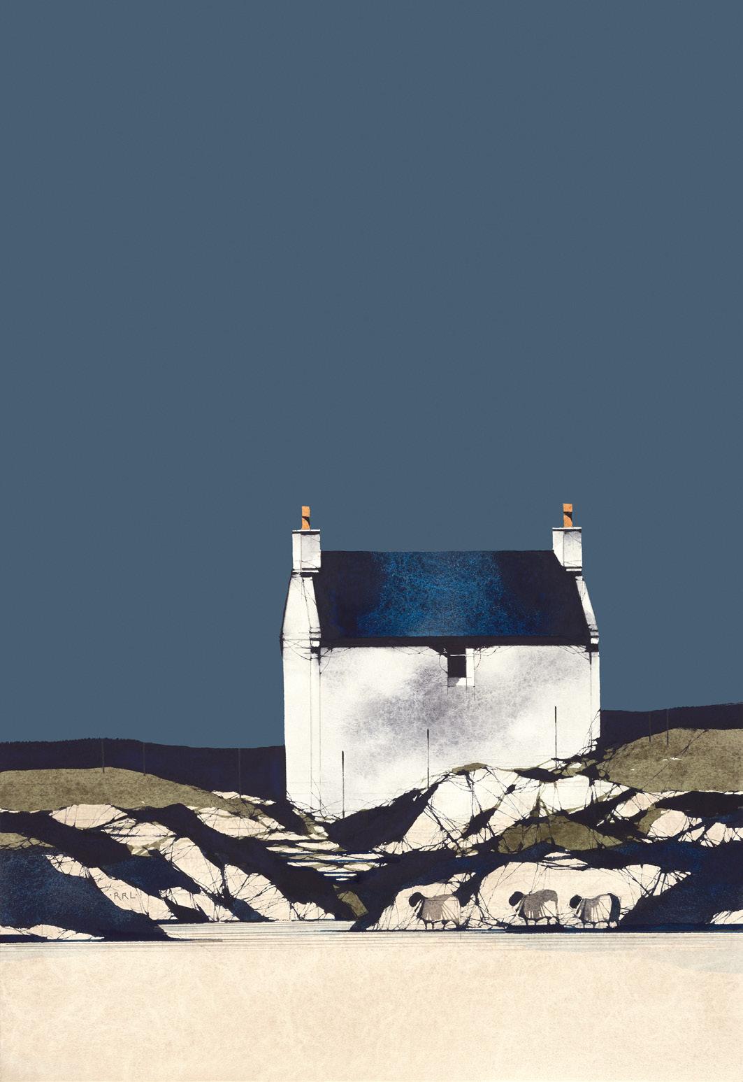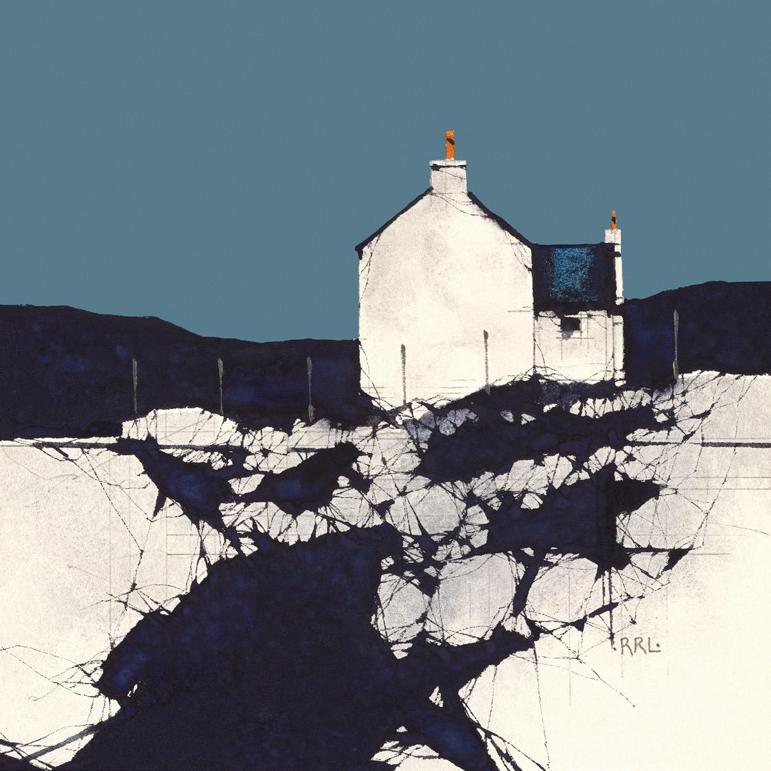 Ron Lawson’s signature style - restrained, precise, and deeply evocative - captures the quiet resilience of crofting communities and the dramatic beauty of wild island vistas. Stone crofts beneath vast, brooding skies convey a profound sense of stillness and solitude, inviting the viewer to experience the landscape not just visually, but emotionally.