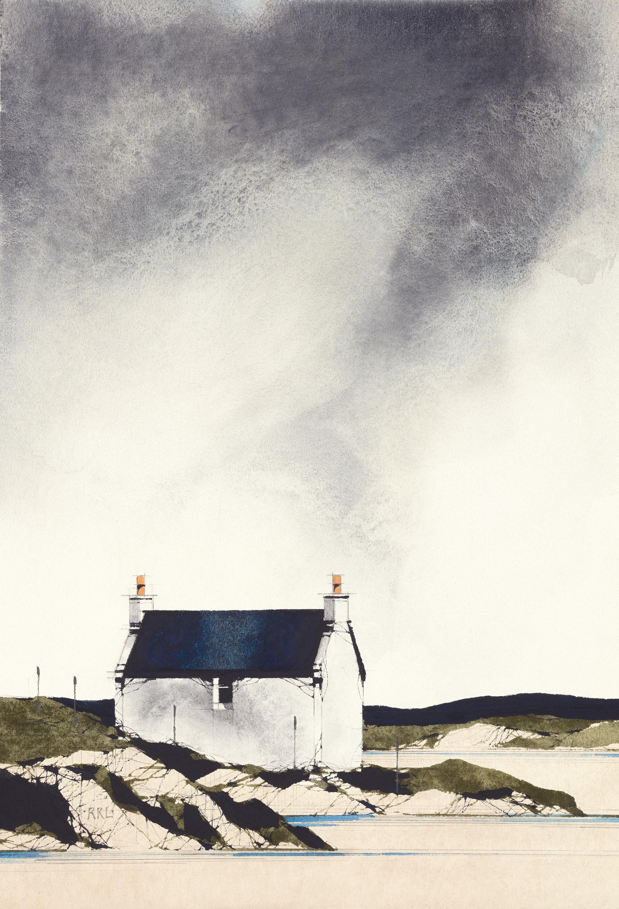 By the mid-1980s, Ron began developing what would become his signature grey skies, and by the 1990s, his focus had turned fully to the Scottish landscape. His now-iconic depictions of crofts and cottages set against vast, atmospheric skies emerged during this period, capturing the solitude and quiet majesty of Scotland’s western isles.