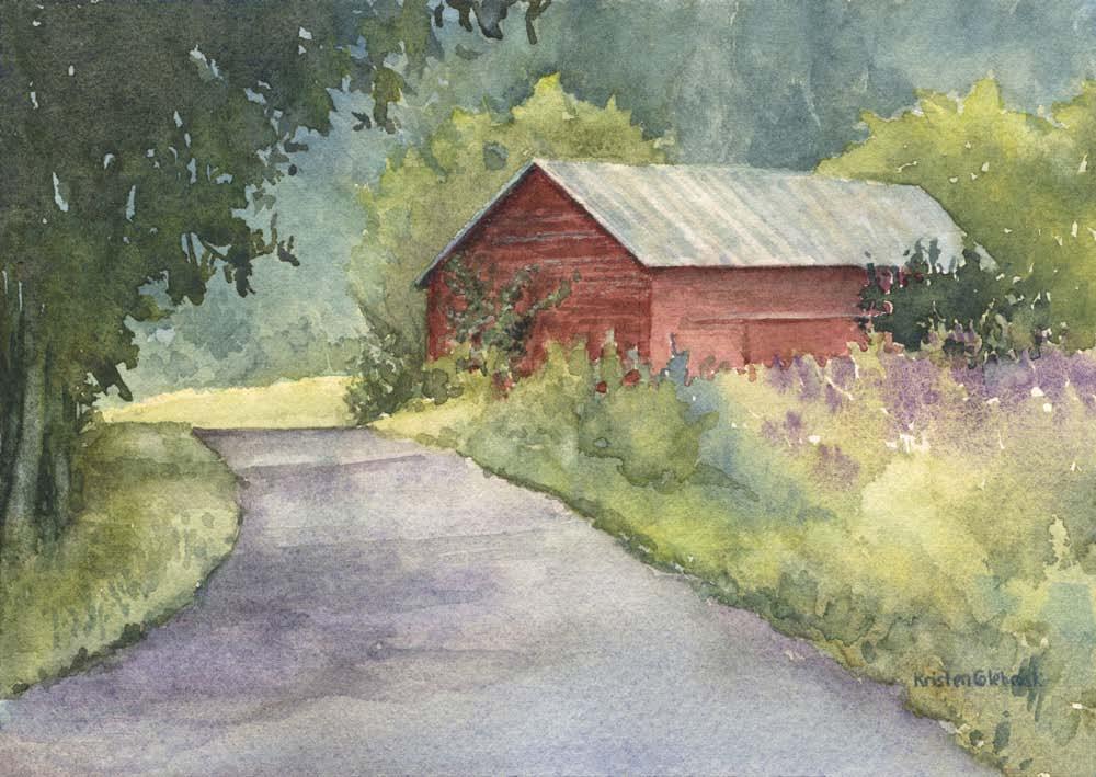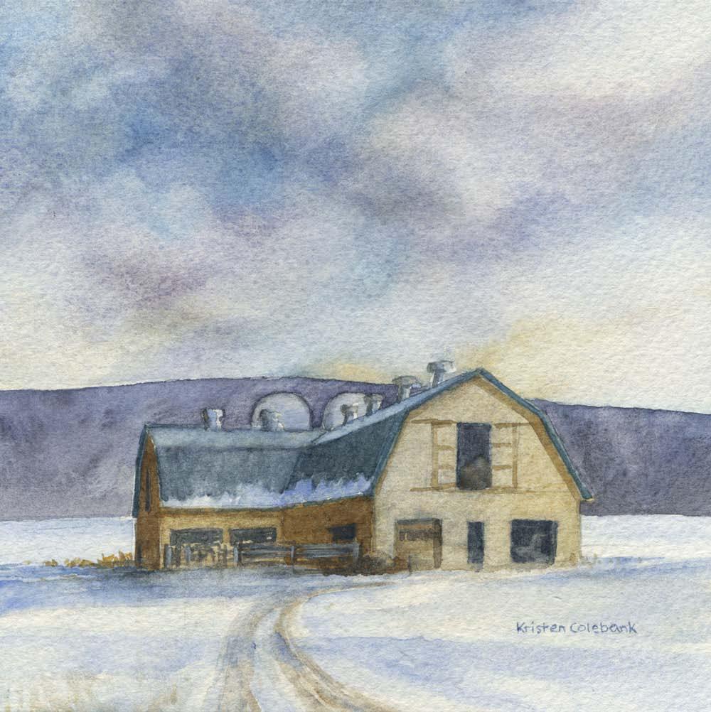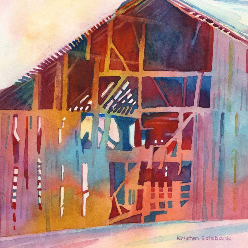 Kristen’s contribution is a set of representational watercolor landscapes featuring barns from the valleys of the Lost River and Cacapon rivers in Hardy and Hampshire counties. Kristen also drew inspiration from Susan’s visual cues of exposed barn timbers to paint a series of abstracted watercolors that focus on barns’ structural elements, revealed by strong value contrasts as light would shine on and sometimes through the buildings.