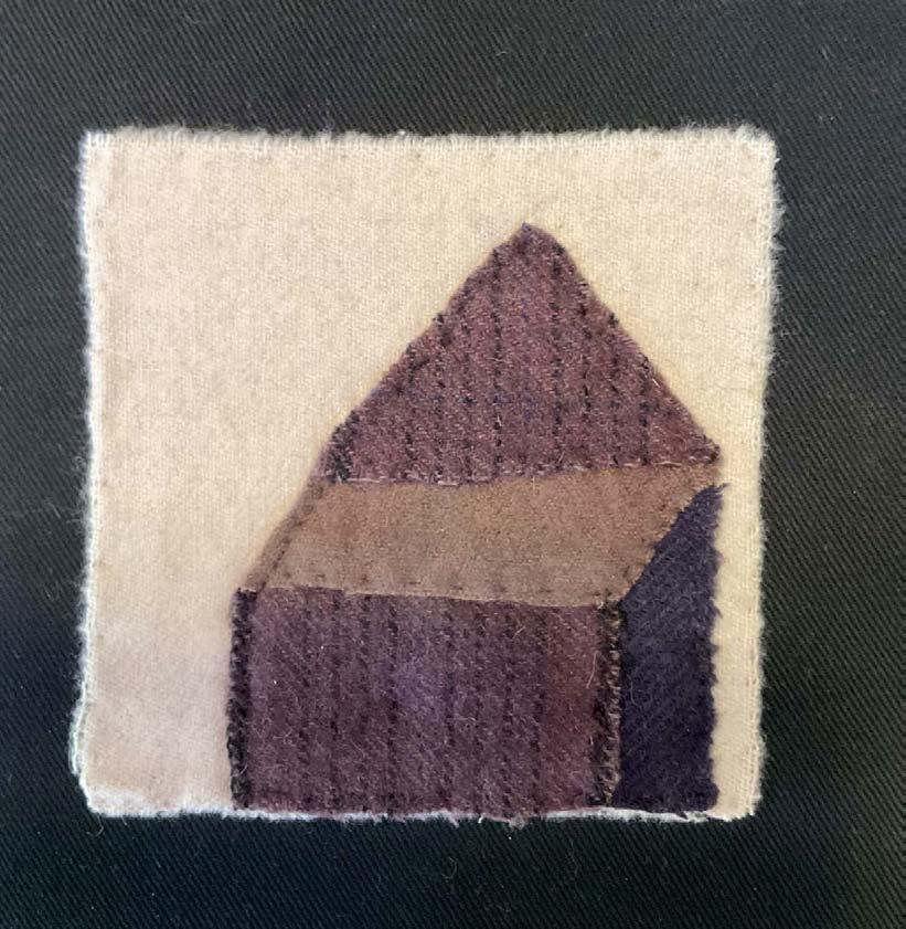 Barn in Daylight Wool appliqué 5x5 mounted, framed 8x8