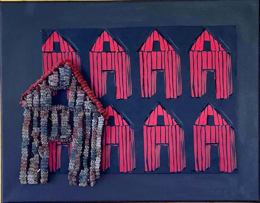 practice by using digital tools to “paint” and experiment with ideas. She ordered custom-printed fabric featuring her designs for use in this collection’s fiber works adding quilting along with rug hooking, painting, and construction to the mix.