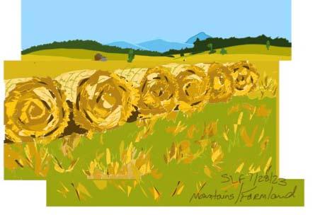 ■ Printed fabric with John Deere tractors, line of hay rolls, Stephen working, nails