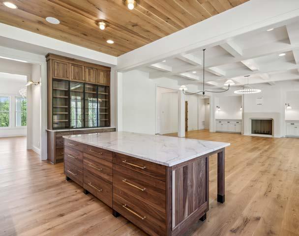 Experience luxury and functionality in this well-designed kitchen. Quartzite countertops and a matching backsplash paired with a fireclay sink and under cabinet lighting offer timeless elegance. The island, with decorative spotlights and drawer storage, is ideal for meal prep and casual dining. A buffet with metal-framed glass doors adds sophistication, while rich walnut cabinets provide ample storage. A wood plank trey ceiling above adds warmth and character, completing this stylish culinary space.