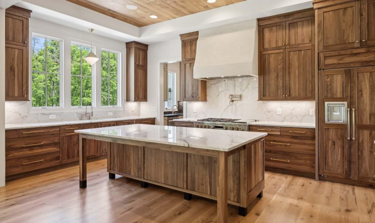 • Kitchen Features Monogram Appliances - Dual Fuel 48” Range, 48” Refrigerator and Dishwasher with Cabinet Panels / Walnut Cabinetry Floor to Ceiling With Black Metal Doors / Quartzite Countertops and Backsplash / Arcustone Custom Built Range Hood / White Oak Ceiling Milled for the Builder at a Local Lumber Mill in Leiper’s Fork