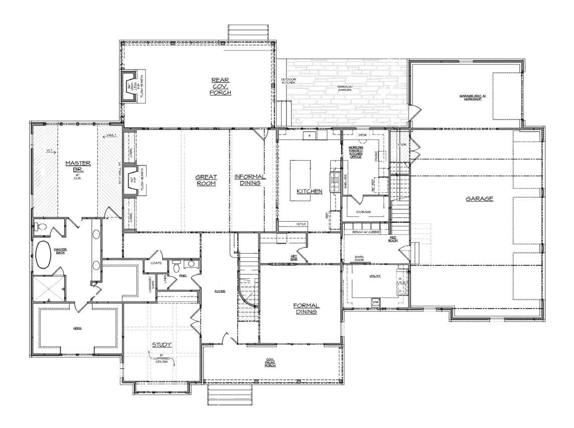 The Covered Front Porch is the perfect space to take in the rolling hills and “while” your time away with a cool beverage on warm summer day. Features include natural stone floor, painted beadboard ceiling, and recessed lighting.