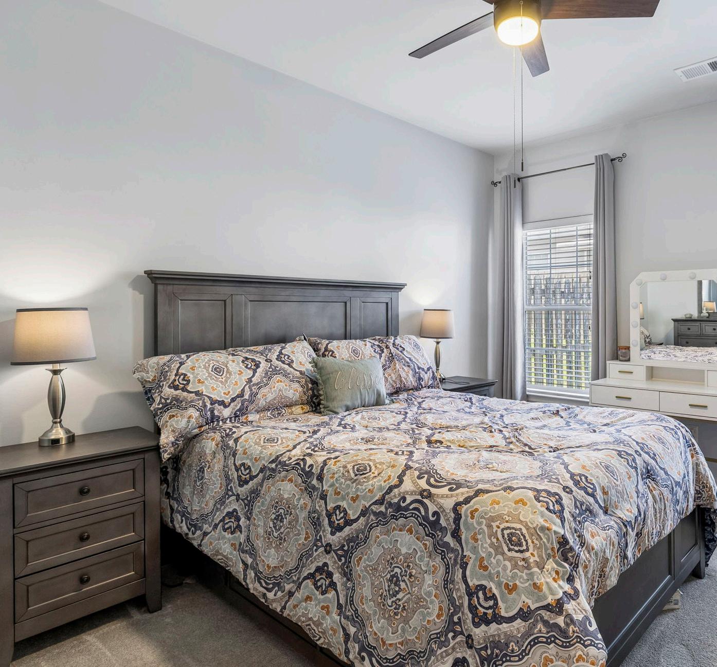 The primary suite is a luxurious escape with brand-new carpeting, two double-door closets, 2-inch blinds on dual windows, and a modern ceiling fan that adds comfort.