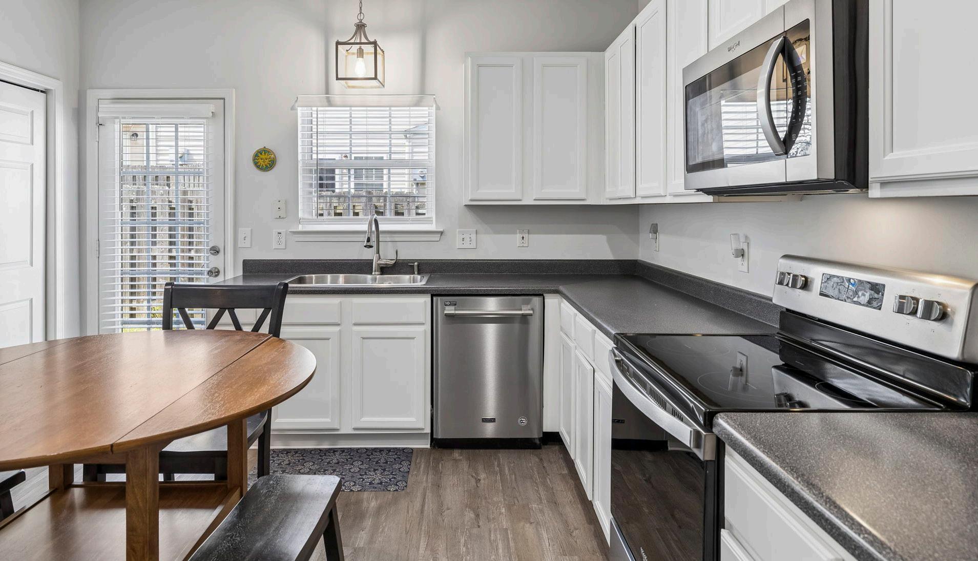 The kitchen blends practical design with luxury finishes, featuring LVP flooring, recessed lighting, and white-painted cabinetry accented with updated wooden and brushed chrome light fixtures. Countertops mimic high-end solid surfaces, while top-tier appliances including a Whirlpool refrigerator, Whirlpool radiant top range/oven, Maytag dishwasher, and Whirlpool microwave complete the space. A new double-bowl stainless steel sink, brushed chrome gooseneck faucet, and garbage disposal offers modern functionality. A spacious 3’ x 8.5’ walk-in pantry under the stairs and an included trash and recycling center offer practical, organized storage. Double doors lead to the laundry area with a HE washer and dryer, while new 2-inch blinds on the windows and patio door allow for privacy and light control.