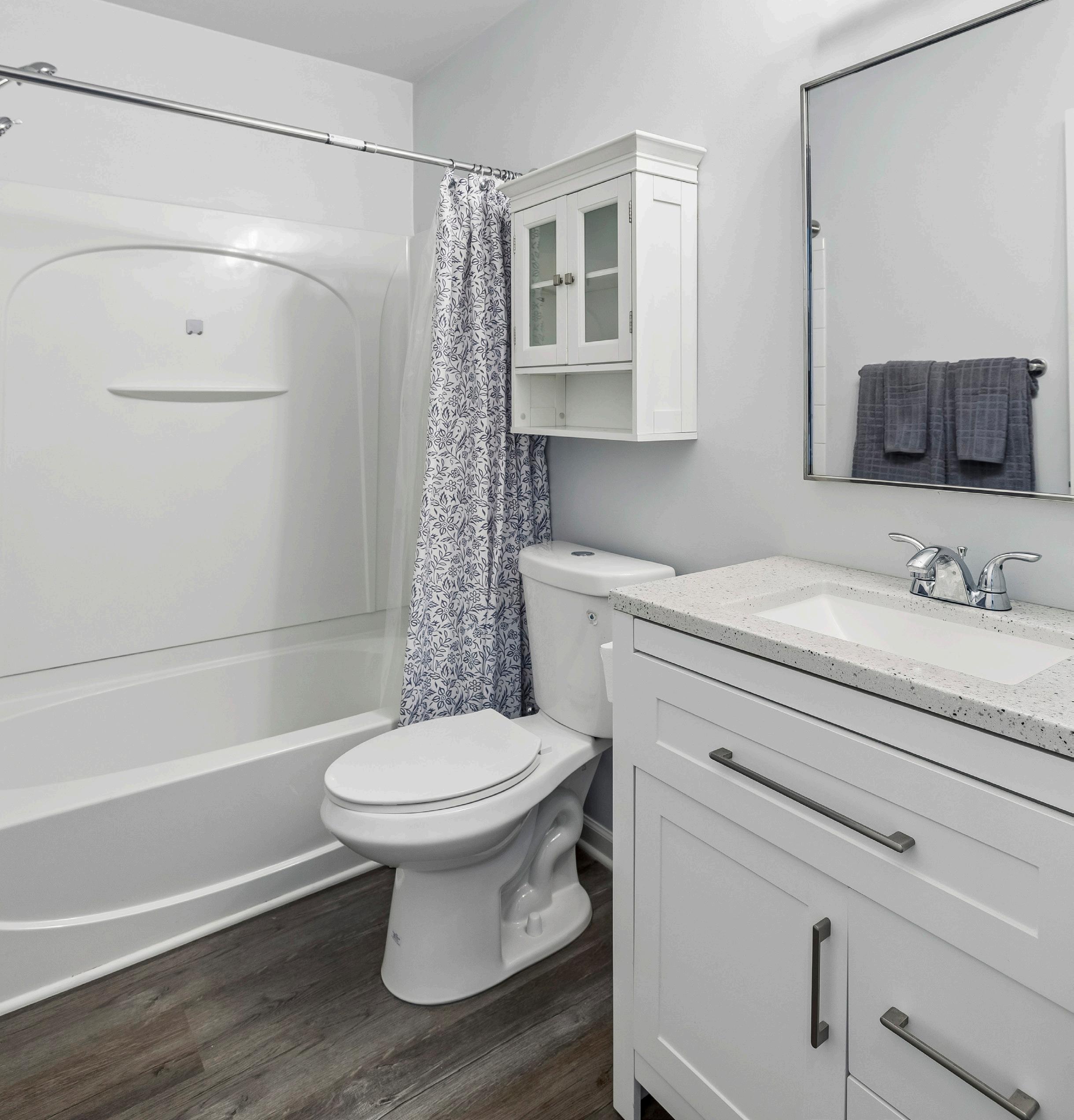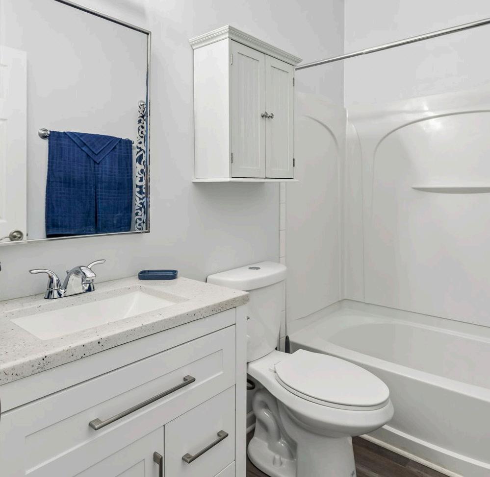 The primary bath has been beautifully renovated with a craftsman-style vanity featuring ample drawers and cabinets, topped with a quartz countertop. Chrome fixtures paired with a matching chrome-framed mirror exude understated elegance. A brand-new Glacier Bay double flush toilet with a push-button flush complements the room’s updating and a cabinet over the toilet provides additional storage. The shower features a versatile handheld showerhead, and the LVP flooring ties together this practical yet stylish space.