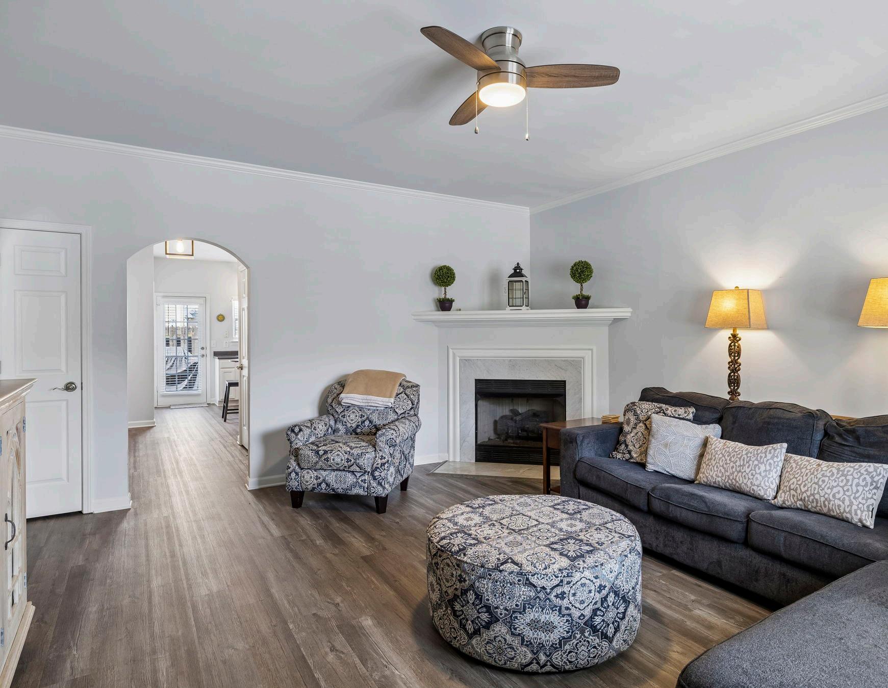 Step into an inviting foyer and family room distinguished by elegant crown molding, arched doorways, and new LVP flooring that flows seamlessly throughout the main living spaces. Natural light filters through 2-inch blinds on the windows, complementing a sleek modern ceiling fan overhead. The room’s centerpiece is a gas log fireplace tucked in the corner, framed in sophisticated gray marble, with a display shelf above perfect for a television or curated décor. A coat or utility closet provides convenient storage, enhancing the room’s functional livability.