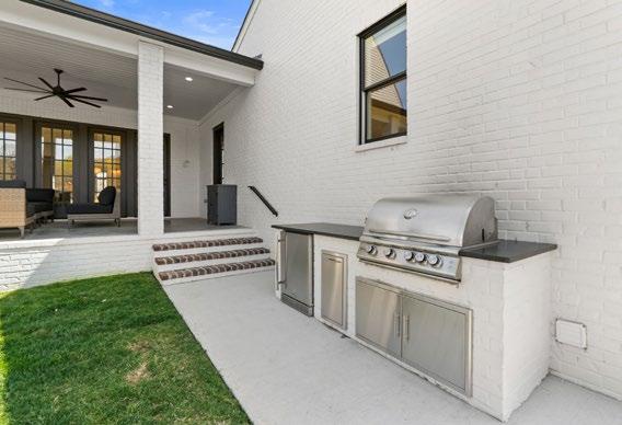 The outdoor Covered Porch is an inviting extension of the home, featuring painted brick columns and a matching painted brick fireplace with a rich wood mantle. A beadboard ceiling, in a light finish to match the exterior, a large ceiling fan, and recessed lighting enhance the ambiance, while the diamond patterned stamped concrete flooring provides durability and style. Above the fireplace, an electrical outlet is pre-wired for a TV, creating the perfect outdoor entertainment space. Just beyond, a built-in grilling station boasts a leathered granite countertop, gas grill, a beverage refrigerator, and a convenient trash pullout, making outdoor dining and gatherings effortless.