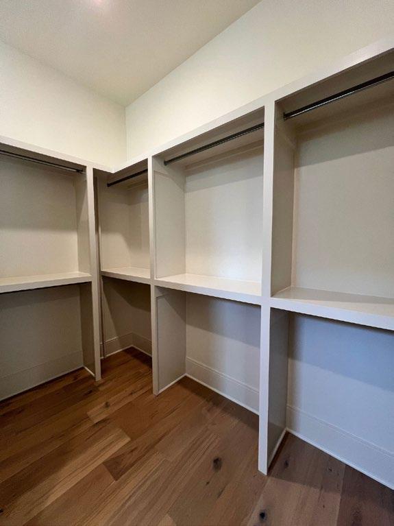 The primary closet seamlessly connects to the Primary Bath, offering a thoughtfully designed space with adjustable wood shelving, ample hanging areas, dedicated shoe cubbies, and convenient pull-out drawers. A transom window allows natural light to filter in, enhancing the airy and organized feel of this luxurious walk-in closet.