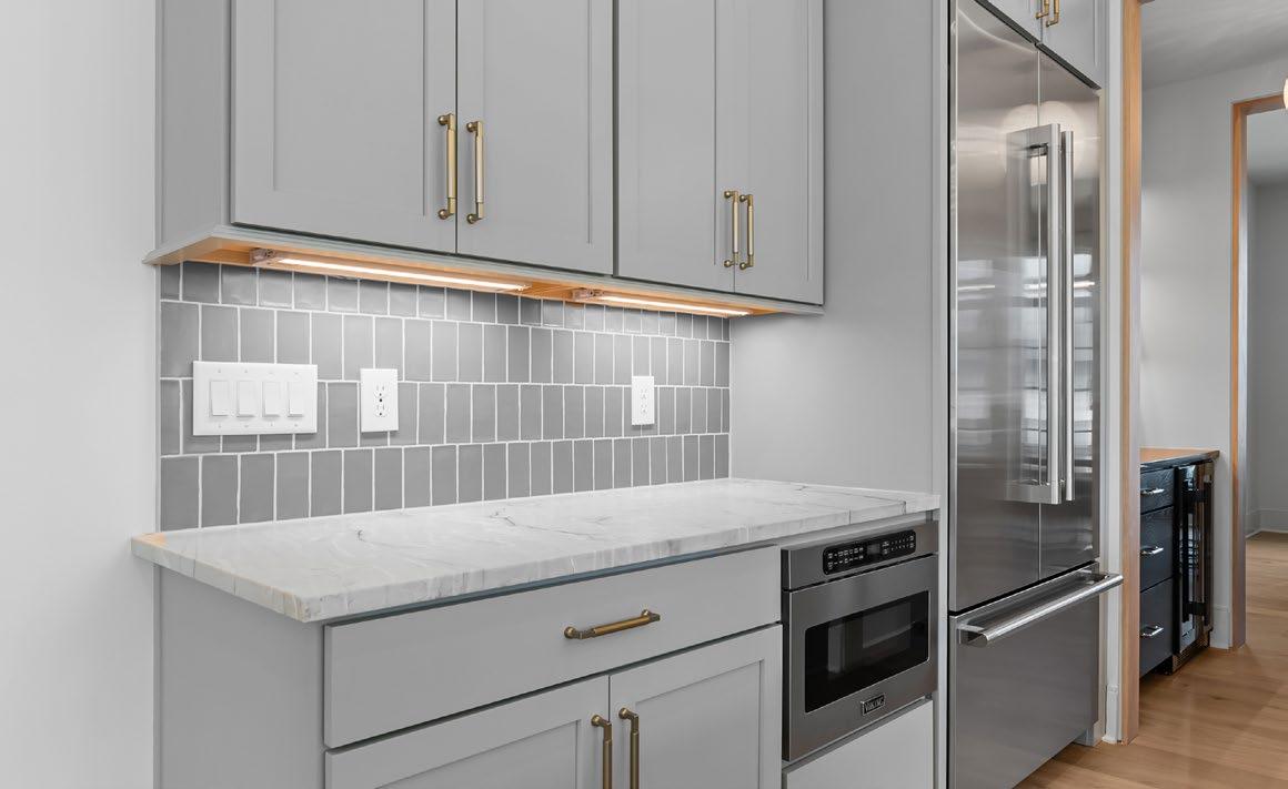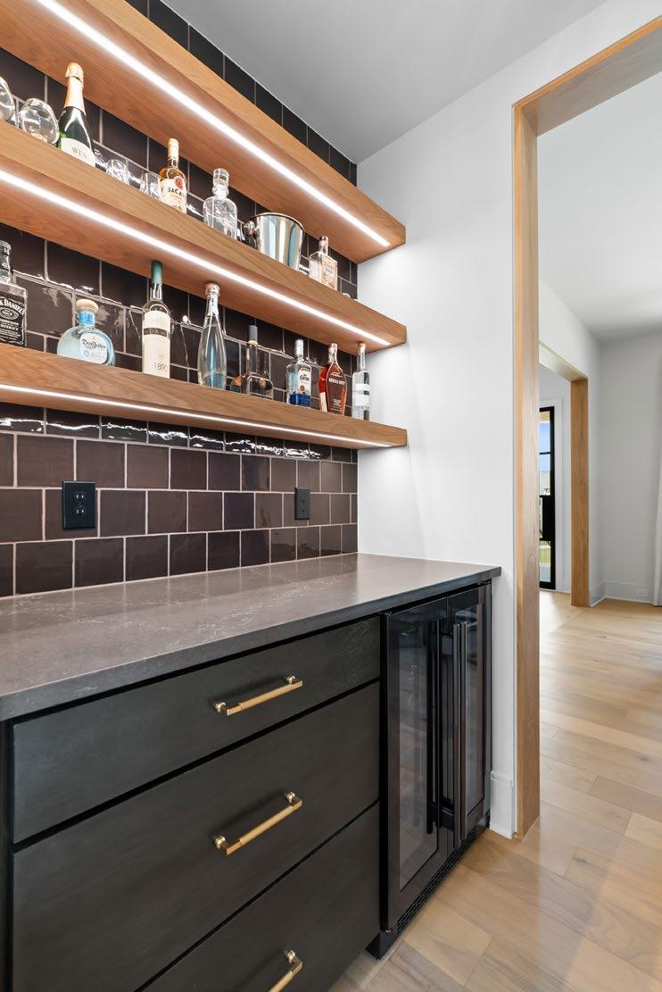 The Butler’s Pantry seamlessly connects the dining room and kitchen, offering both elegance and functionality. Rich cabinetry with a quartz countertop and a stylish tile backsplash provides ample storage and prep space. Floating shelves, illuminated by strip lighting, create a warm ambiance, perfect for displaying glassware or décor. A built-in wine refrigerator adds a touch of luxury, making this space ideal for entertaining and effortless hosting. Conveniently located on the opposite side, a walk-in pantry provides storage for all of your non-perishable foods.