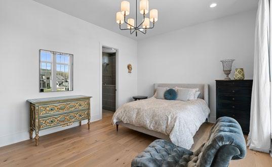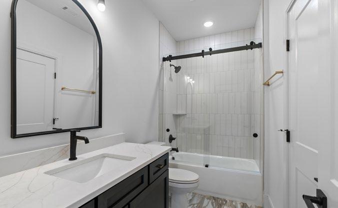 Bedroom #5 offers wide-plank hardwood flooring and two windows overlooking the porte-cochère patio. Recessed lighting enhances the room’s ambiance, and the walkin closet with wood shelving provides plenty of storage. The bathroom, accessible from both the bedroom and the bonus room, features marbled patterned tile flooring, black-painted cabinetry with a contrasting light countertop, and black faucets and fixtures. The tub-shower combination boasts a floor-to-ceiling tile surround and a frameless sliding glass enclosure, integrating grace and function.