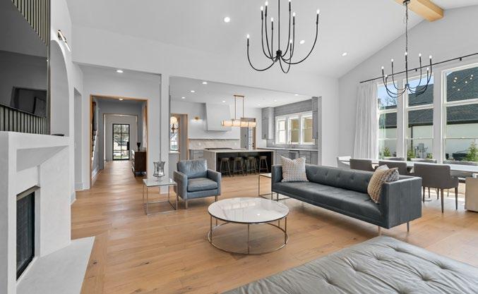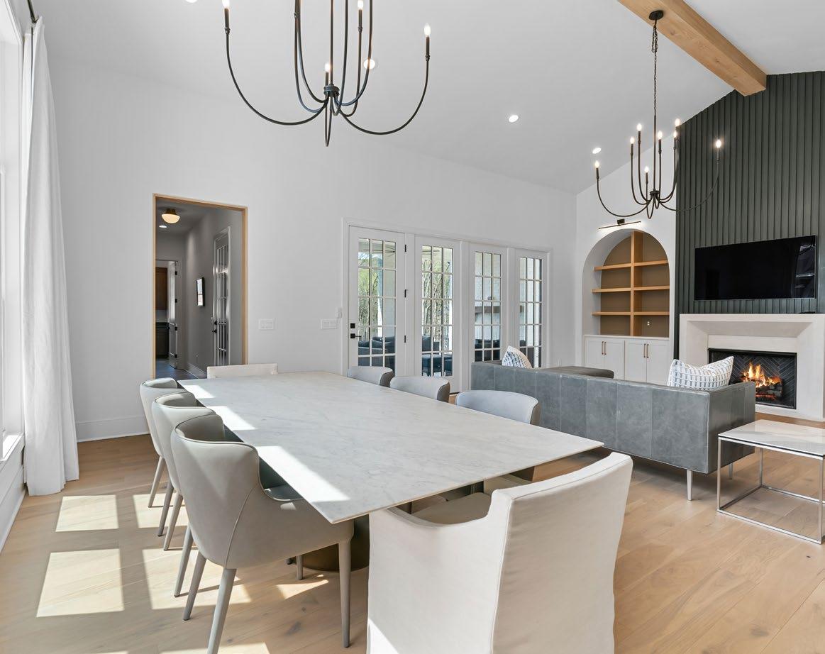A custom woodwork accent wall, painted in a rich hue, adds depth and character to the space. Large windows frame scenic views of the front yard, filling the room with natural light, while a chic chandelier serves as the perfect finishing touch, casting a warm and inviting glow over every gathering.
