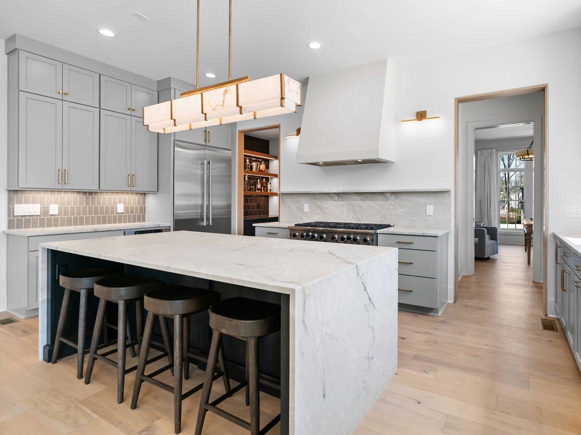 The expansive kitchen is a chef’s dream, centered around a massive quartz island with a striking waterfall edge, seamlessly overlooking the family room. White-paneled cabinetry, accented by painted gray upper cabinets extending to the ceiling, adds depth and refinement, while under-cabinet lighting enhances the elegant tile backsplash. A microwave drawer is seamlessly integrated for convenience, and the undermount sink with a sleek gooseneck faucet offers both style and functionality. Above the sink is a wall of windows bathing the space in natural light, offering views of the Porte Cochere patio. The industrial-style gas range, enhanced by a sleek quartz backsplash, serves as both a functional workspace and a stunning focal point. Soft-close doors and drawers, an oversized industrial refrigerator, and exquisite tile details above the windows complete the space. Open to both a Butler’s pantry and a cozy sitting area by the Friends Entry, this kitchen blends luxury with practicality, designed for effortless entertaining and everyday living.