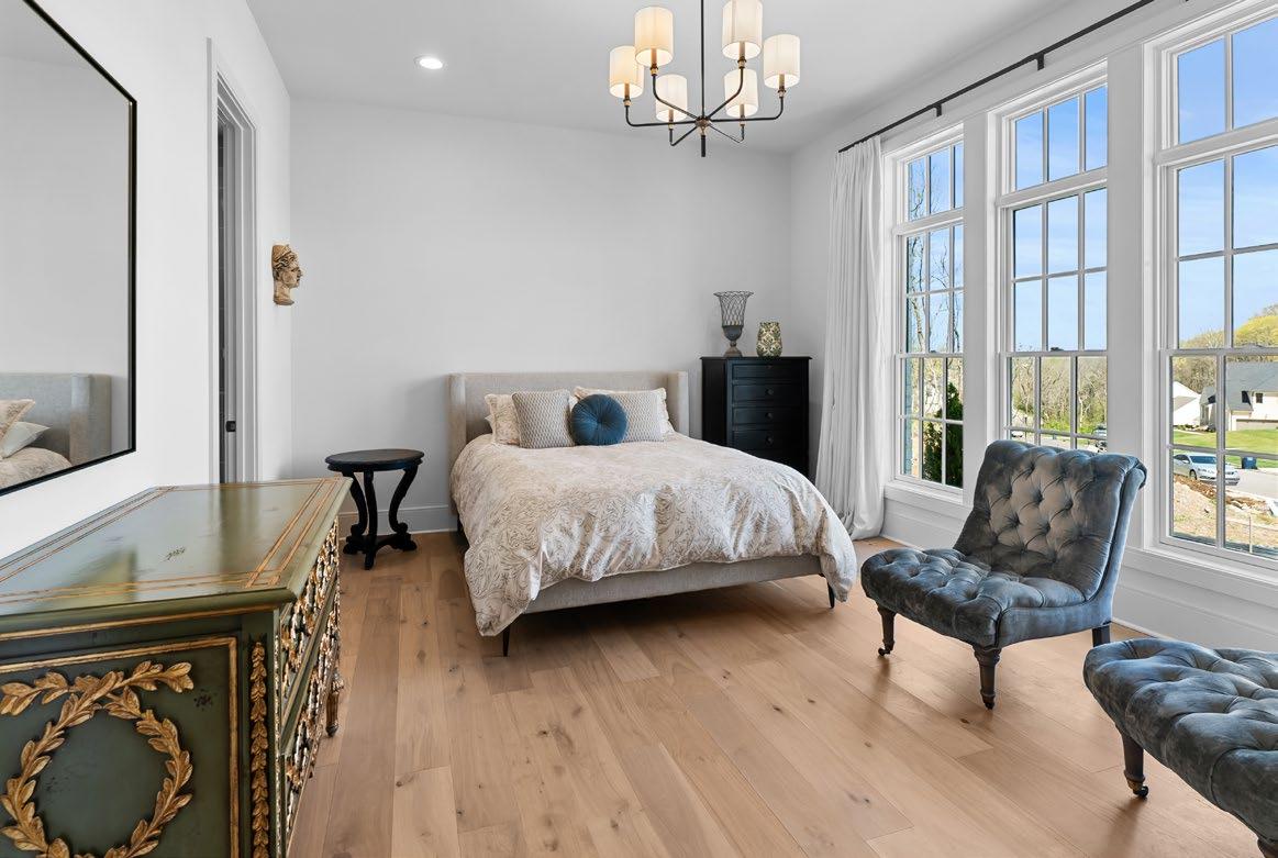 The main-level primary suite is a serene retreat, featuring expansive windows with transoms that frame picturesque views of the fenced backyard and rolling Williamson County hills. Wide plank hardwood floors add warmth and sophistication, while a candelabra chandelier casts a soft glow. The wood-trimmed ceiling detail enhances the room’s elegant ambiance, creating a space that is both grand and inviting.