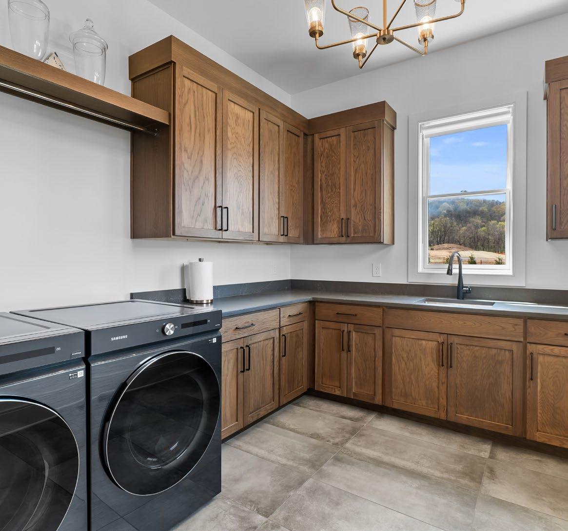 Stepping in from the garage, you’re welcomed into the cubby area, designed for effortless organization. Tile flooring complements a stained wood bench, while built-in storage offers dedicated space for backpacks and sweaters with pullout drawers and upper cabinets. This space and tile flooring flows seamlessly into the laundry room, where stained upper and lower cabinetry provide ample storage. A leathered granite countertop offers plenty of folding space, while a built-in sink with an oil-rubbed bronze gooseneck faucet sits beneath a window overlooking the backyard, bringing in natural light to enhance functionality and style.