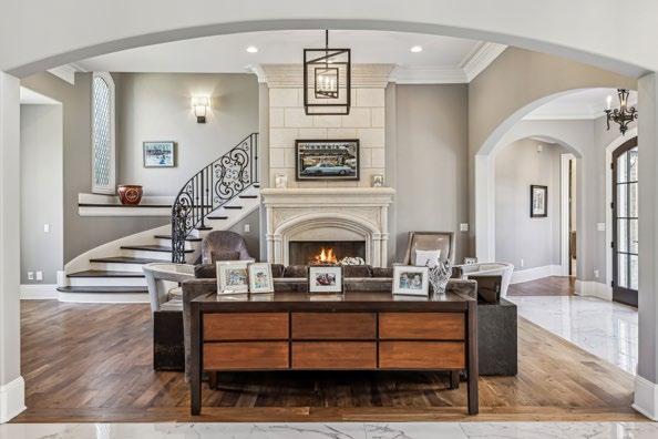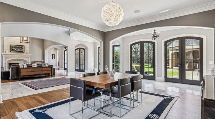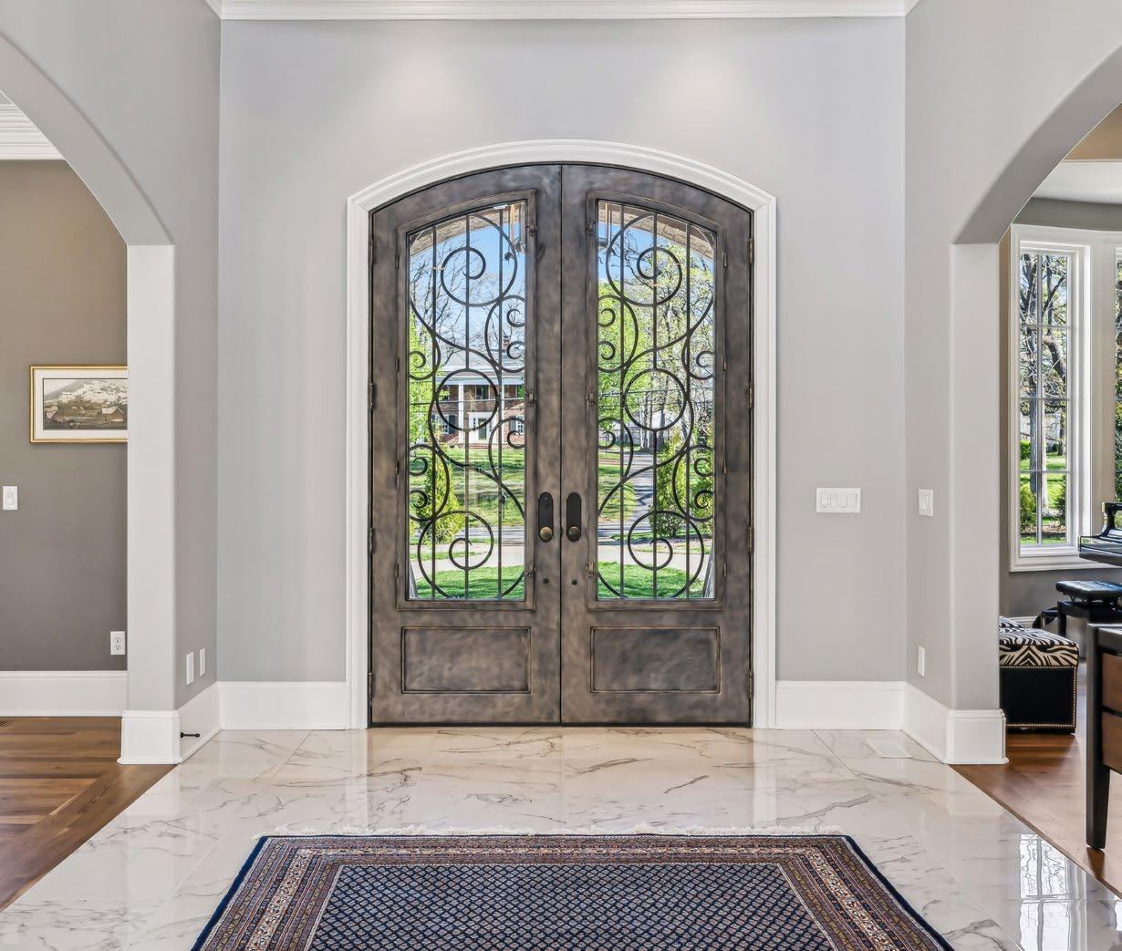 From the moment you step through the arched double iron doors into the breathtaking two-story Grand Foyer, you’re enveloped in a sense of timeless elegance and grandeur. The radiant Calacatta marble flooring stretches across the foyer and main hall, its luxurious finish perfectly balancing modern sophistication with enduring strength. Rich walnut floors flow seamlessly throughout the home, adding warmth and depth to every step. Your eyes are drawn upward to the stunning barrel-vaulted ceiling, where a glowing lantern-style chandelier casts a soft, welcoming light. Twin balcony overlooks with intricate hand-forged iron railings add a touch of romance, while an expansive wall of windows and French doors flood the space with natural light, blurring the line between indoors and out. Every detail has been thoughtfully curated - from the rich flooring and intricate crown molding to the subtle ceiling accents, integrated sound system, and artfully placed recessed lighting—creating an atmosphere that’s both luxurious and inviting.