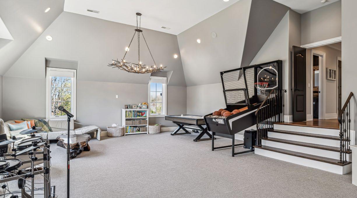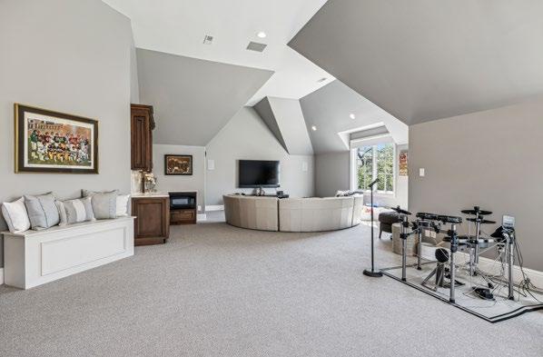 Grab a tub of popcorn and settle in—this well-appointed Bonus Room is the ultimate entertainment haven. Designed with both comfort and convenience in mind, it features a stylish wet bar complete with a high-end quartz countertop, copper sink, marble backsplash, built-in coffee maker, microwave, and a refrigerator with an ice maker—perfect for hosting movie nights or game days. For the ultimate viewing experience, the room is equipped with a surround sound system, featuring custom sound bars and subwoofers, delivering crisp, immersive sound for streaming music and TV. Volume ceilings enhance the spacious feel, while plush Berber carpeting layered over a memory foam pad adds cozy comfort underfoot. A striking tree limb-inspired chandelier serves as a bold design statement, and a second laundry area steps away adds functionality to this multi-purpose retreat.