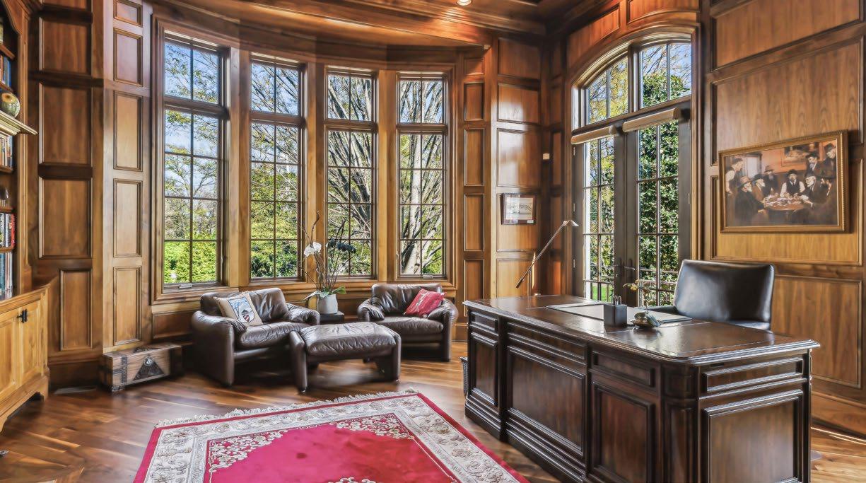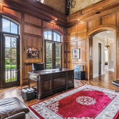 A soaring vaulted ceiling adds a sense of grandeur, accentuated by a bold, intricate iron chandelier that makes a commanding statement. With ample space for a substantial desk, a fireside sitting area, and a bay window nook ideal for reading or strategy sessions, this Study is as functional as it is impressive—a true executive retreat right at home.