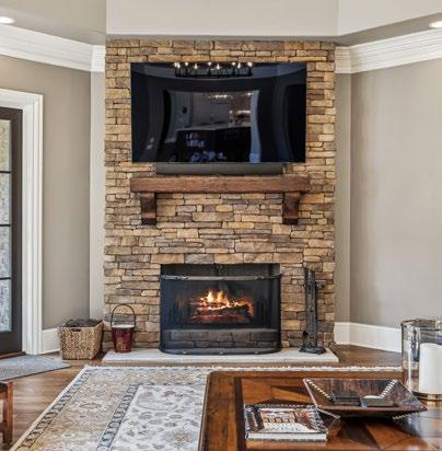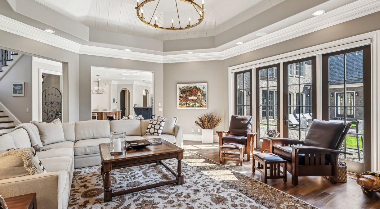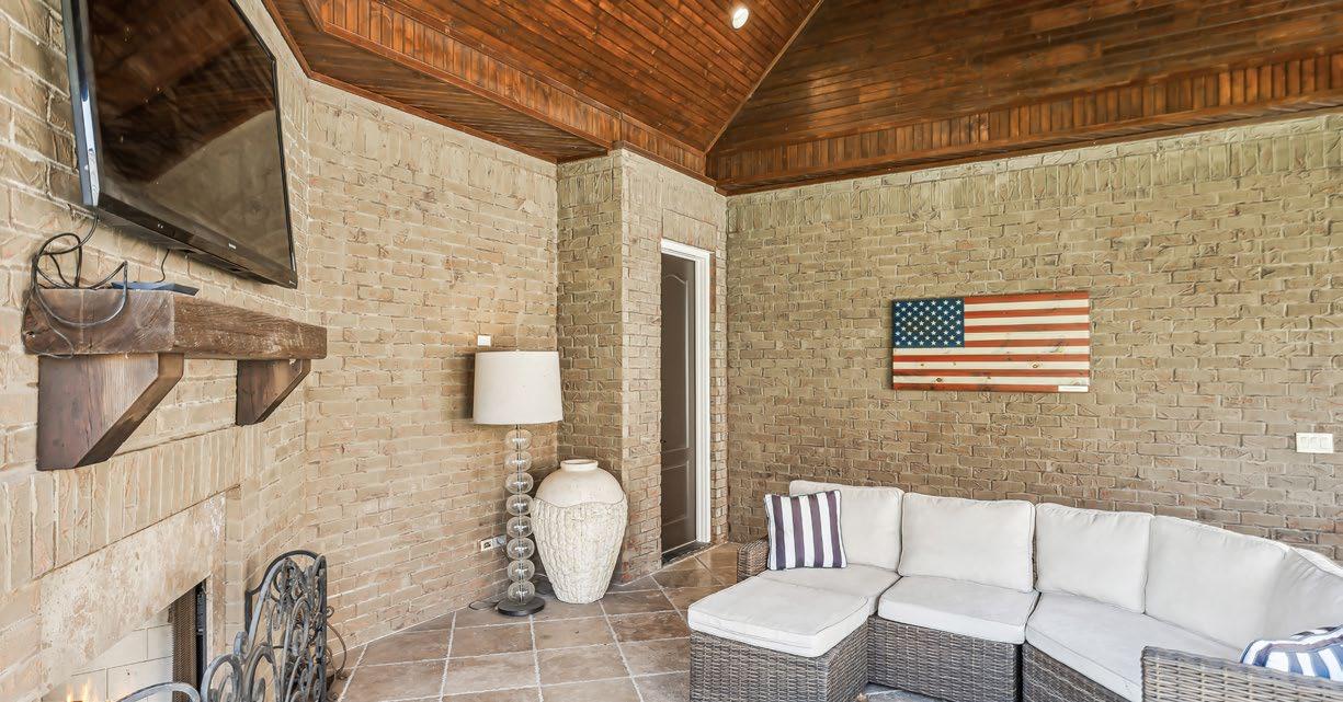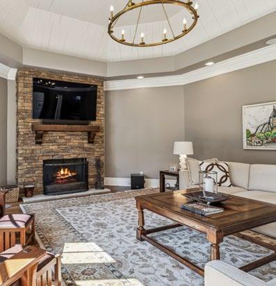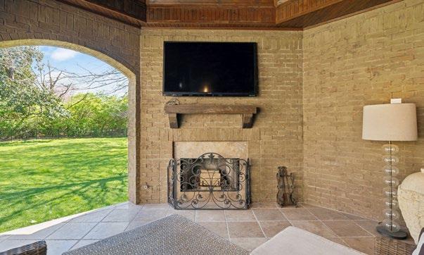 The Family Room is an inviting and spacious retreat, perfect for entertaining or relaxing with loved ones. Framed by sweeping views of the lush backyard and mature trees beyond, this room is bathed in natural light from multiple windows and a glass door that opens to the covered porch, effortlessly blending indoor and outdoor living. A striking floor-to-ceiling stone gas fireplace with a rich wood mantle anchors the space, offering both warmth and charm. For the ultimate entertainment experience, integrated surround sound with custom sound bars and subwoofers enhances the atmosphere, filling the room with crisp, immersive sound for streaming music or TV. Additional touches of character include a bronze chandelier that adds a soft, ambient glow and a beadboard tray ceiling that brings texture and architectural interest to this beautifully designed room.