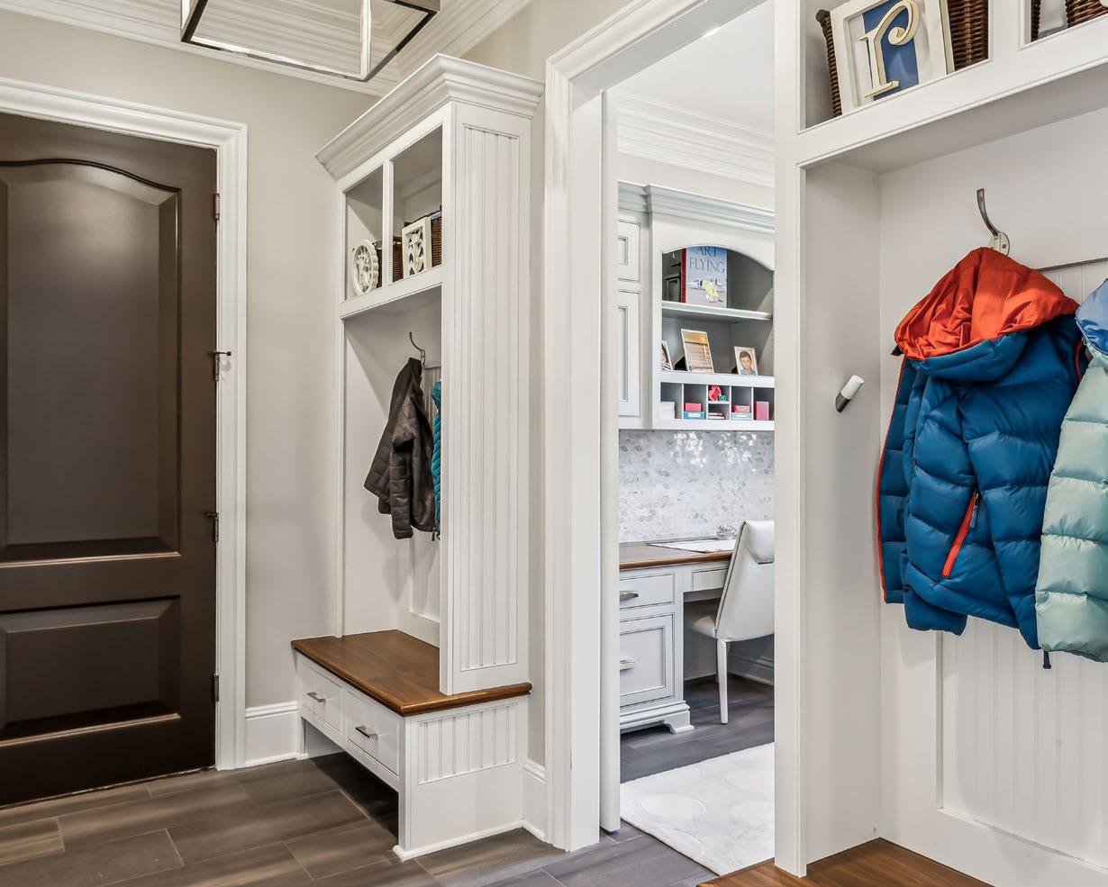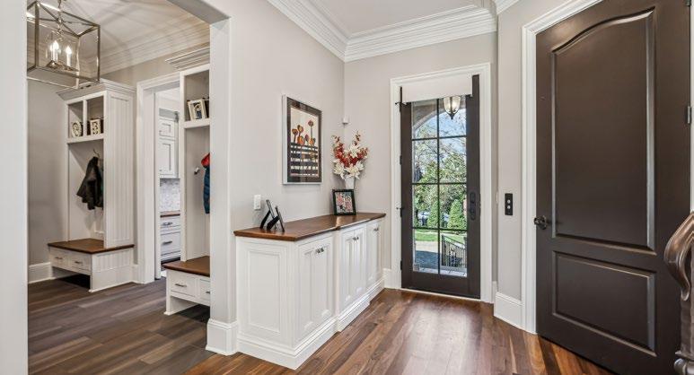 Conveniently located between the Kitchen and Garage, the Drop Zone is thoughtfully designed to blend function and style. A newly installed sliding barn door maximizes usable space, while two sets of custom cubbies with hooks provide the perfect spot to keep bags and jackets organized. Hardwood benches with built-in drawers and shoe storage below add warmth and practicality, complemented by sleek modern tile flooring that enhances the room’s contemporary feel. Just steps away, the covered Friend’s Entry features a counter-height built-in cabinet—ideal for stashing keys, purses, or mail—and offers easy access to both the back staircase and the elevator, enhancing flow and everyday convenience.