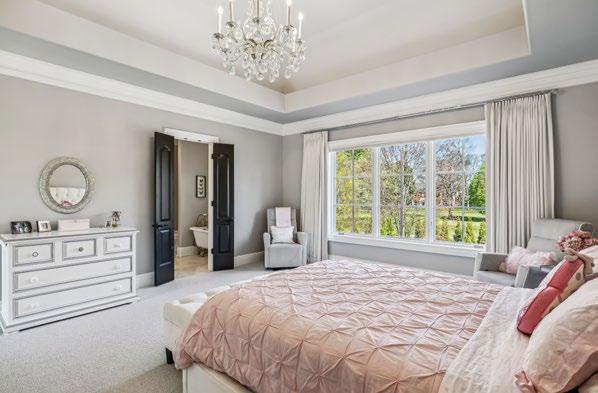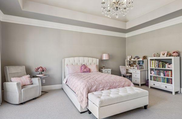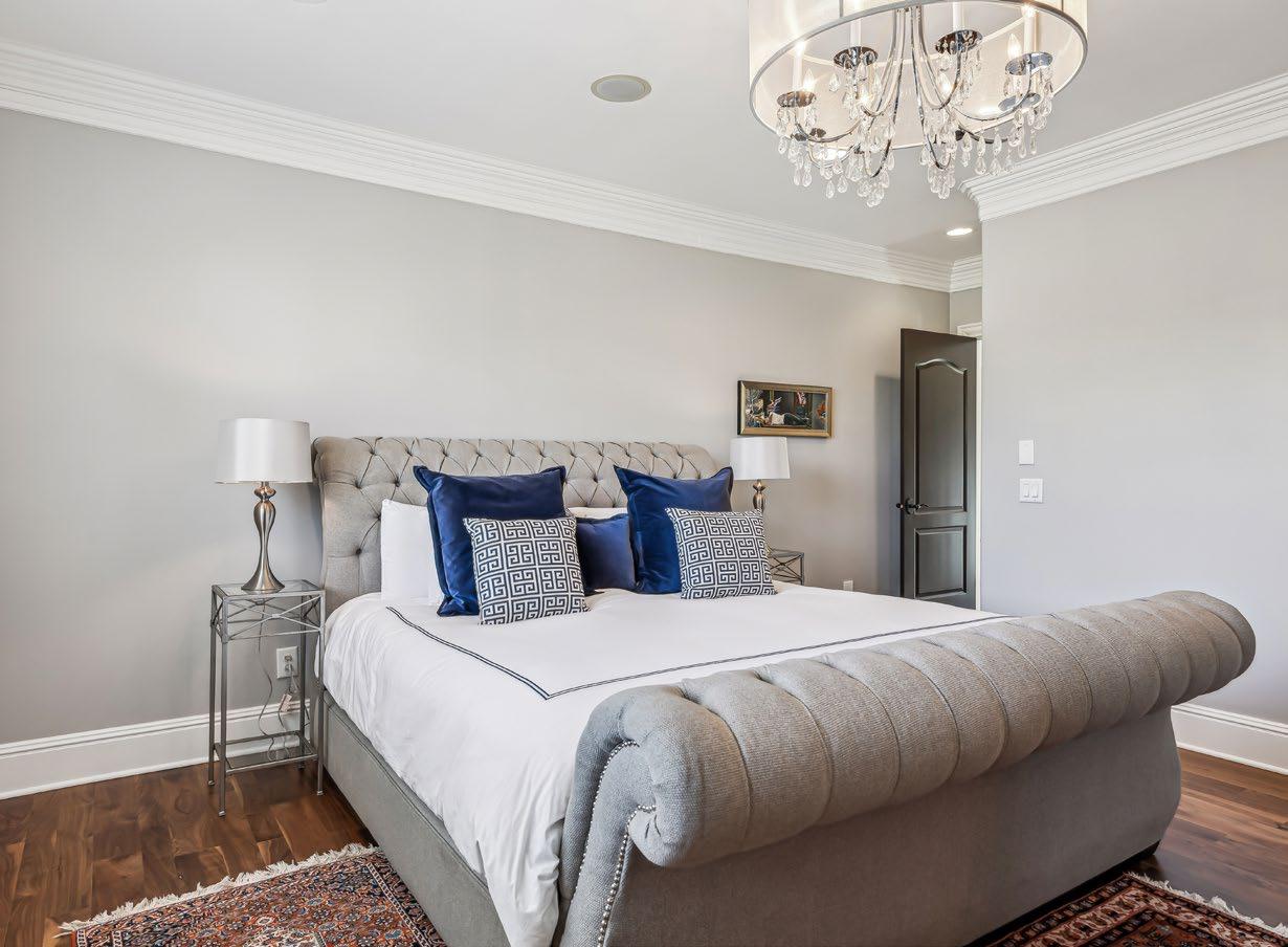 Bedroom #4 exudes elegance with its tray ceiling crowned by a crystal-accented candelabra chandelier, creating a soft, luxurious ambiance. The room features plush Berber carpeting layered over a memory foam pad for enhanced comfort, and expansive windows outfitted with Hunter Douglas automated blackout shades for effortless light control and privacy. Additional highlights include a generous walk-in closet and a private en-suite bath, making this space both stylish and functional.