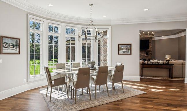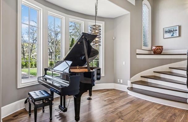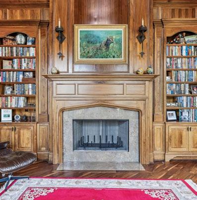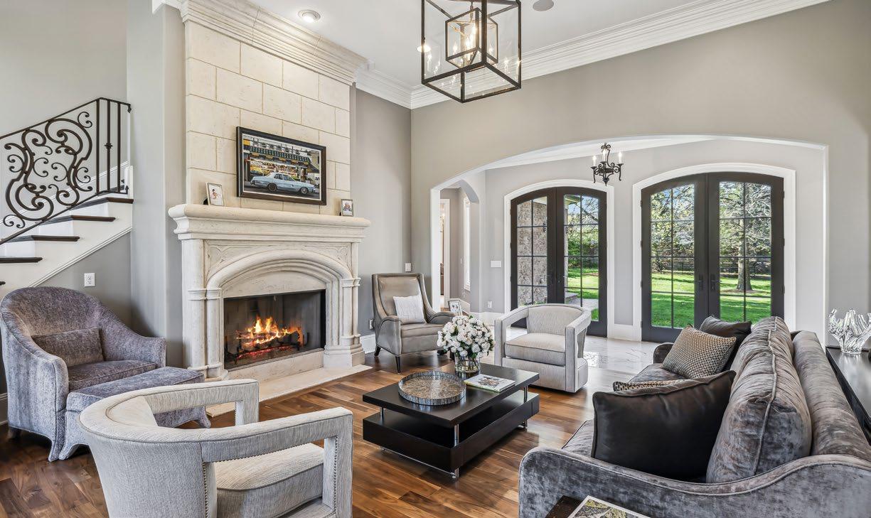 Flowing seamlessly from the Grand Foyer, the open Formal Living Room is a stunning showcase of light, elegance, and architectural charm. The wall of windows bathes the space in natural sunlight, while two sets of French doors open to a serene private courtyard, marrying indoor comfort and outdoor beauty. The curved staircase is a true work of art—adorned with rich hardwood treads, intricate iron detail, and a striking leaded glass window that casts a soft, luminous glow. A lantern-style chandelier adds warmth and character from above, while the stately stone fireplace, complete with a hand-carved mantle and surround, becomes the room’s inviting focal point. A graceful bay window adds the perfect finishing touch to this captivating and timeless space.