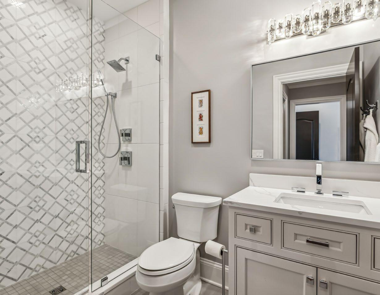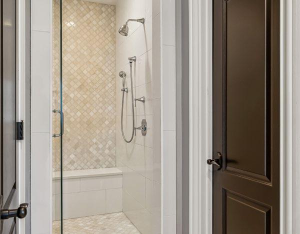 The Primary Bath makes a striking impression, offering a sanctuary of luxury and elegance. A grand, dual-head walk-through shower, complete with a handheld and bench, stands in perfect harmony with the oversized free-standing tub, creating a tranquil yet bold centerpiece. The shower itself is a masterpiece, featuring a frameless enclosure, chrome fixtures, invigorating body sprayers, and an eye-catching tile accent, all set against the timeless beauty of penny round tile flooring.