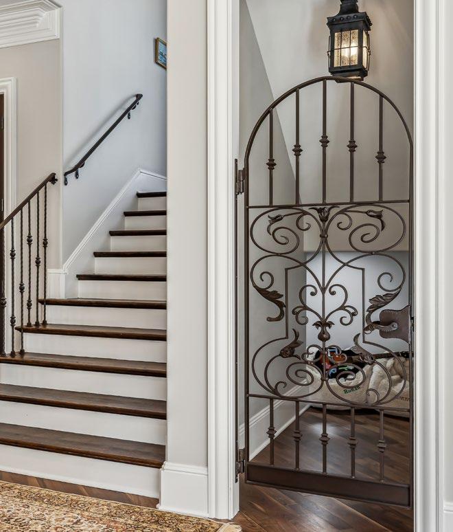 Beneath the curved staircase, a charming iron-gated nook—currently serving as a playful hideaway —offers exciting potential as a wine room or stylish extra storage. This is not just a kitchen; it’s a masterpiece of craftsmanship, where warmth and luxury come together in perfect harmony.
