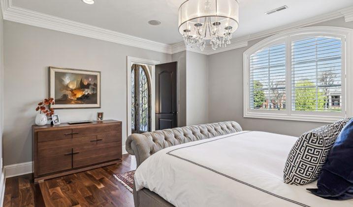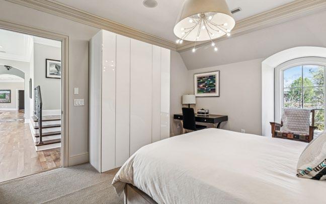 The spacious Guest Bedroom features elegant plantation shutters on an arched double window, complemented by Hunter Douglas automated blackout treatments for ultimate comfort. A crystal and chrome chandelier casts a soft glow, while the walk-in closet with built-ins and attic access add thoughtful touches of convenience. The room also includes a private bath for your guests’ relaxation. For an added sense of luxury, a charming seating area overlooks the Grand Foyer, and a private balcony offers breathtaking views framed by stunning iron and wood cathedral-style doors.