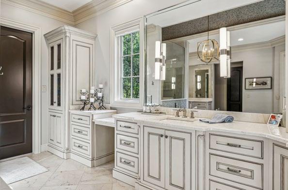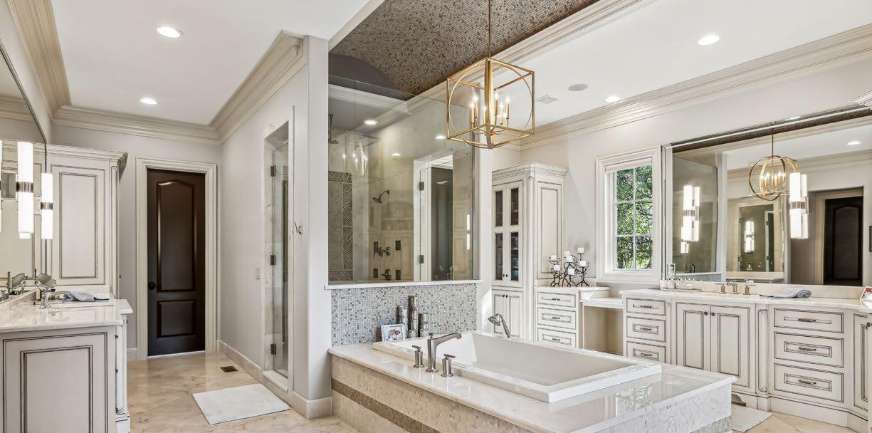 Thoughtfully designed for two with separate vanities that offer spacious drawer stacks, knee space, oversized mirrors, soft sconce lighting, and luxurious granite countertops. The floor is graced with large-scale limestone tiles, further elevating the room’s sense of grandeur. For those who appreciate the finer details, a built-in coffee bar and mini fridge offer a touch of convenience and indulgence.