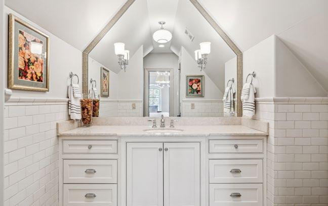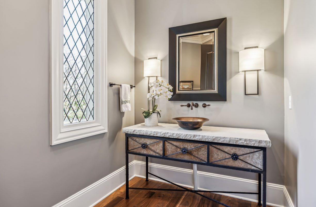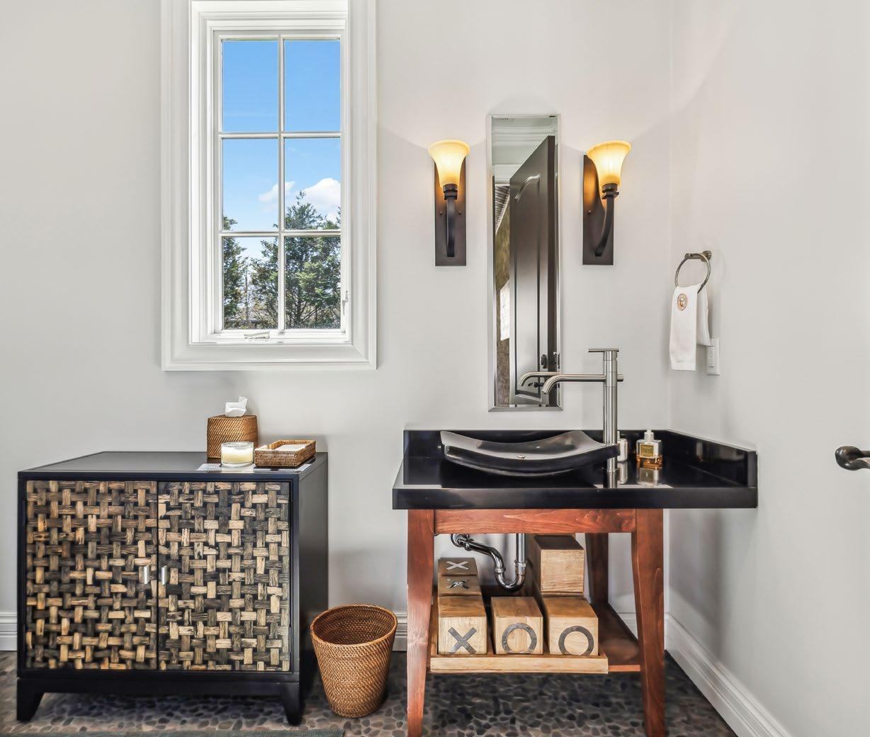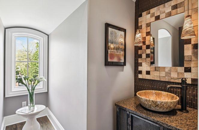 The Upstairs Powder Room is a stylish retreat, featuring a beautifully crafted furniture-style vanity topped with a sleek granite countertop. A striking vessel bowl sink adds a modern touch, while a tile-framed mirror and elegant pendant lights enhance the space’s sophistication. The full-wall tile backsplash creates a seamless, contemporary look, and an arched window allows natural light to fill the room, creating a bright and inviting atmosphere.