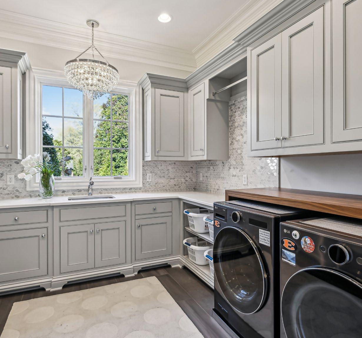 This expansive Laundry Room transforms everyday tasks into an enjoyable experience with its carefully designed layout and luxurious touches. Custom cabinetry topped with sleek quartz counters provides ample workspace and storage, while a built-in desk area with a rich walnut surface adds versatility and warmth to the space. Durable plank tile flooring runs throughout, complemented by a stunning full-height marble backsplash in an elegant leaf pattern. Practical features include designated laundry basket storage, and a convenient hanging rod. A sparkling crystal chandelier adds a touch of glamour above the laundry sink, and a new large-capacity LG washer and dryer complete this beautifully functional space.