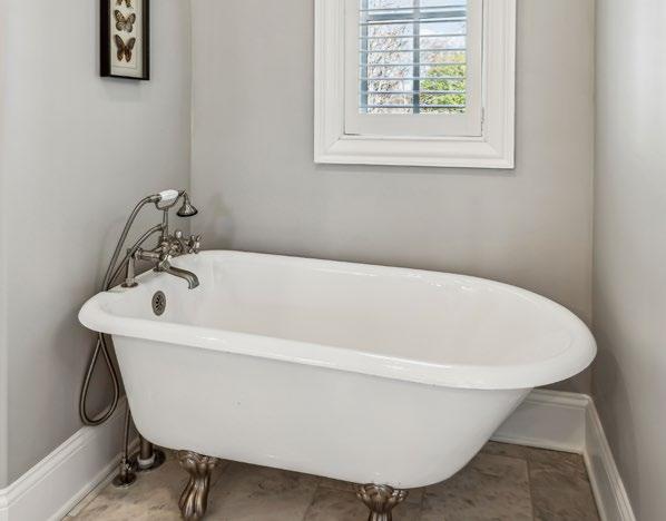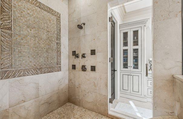 Step through double doors into this beautifully appointed bath—a serene, spa-like retreat thoughtfully updated with high-end finishes. Elegant marble tile flooring sets the tone, complemented by a timeless clawfoot tub and a sophisticated vanity topped with a marble countertop, complete with drawer stack and ample cabinet storage. Crystal sconces and a designer mirror add a touch of glamour. The walk-in shower is a true showpiece, featuring a marble arabesque accent wall and matching flooring, a built-in bench, and a sleek glass door. Premium Rohl fixtures at the sink, shower and tub elevate the space with a refined, luxurious finish.