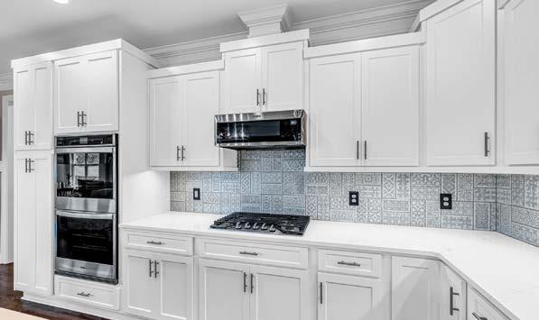 Chef’s Kitchen with Quartz Counters, Lazy Susan, Soft-Close Drawers and Doors, Patterned Tile Backsplash, Under Cabinet Lighting, Island with Bar Overhang, Recessed Lighting, Rustic Light Fixture, and Stainless Appliances Including 4-Burner Gas Cooktop, Microwave, Dishwasher, and Double Ovens