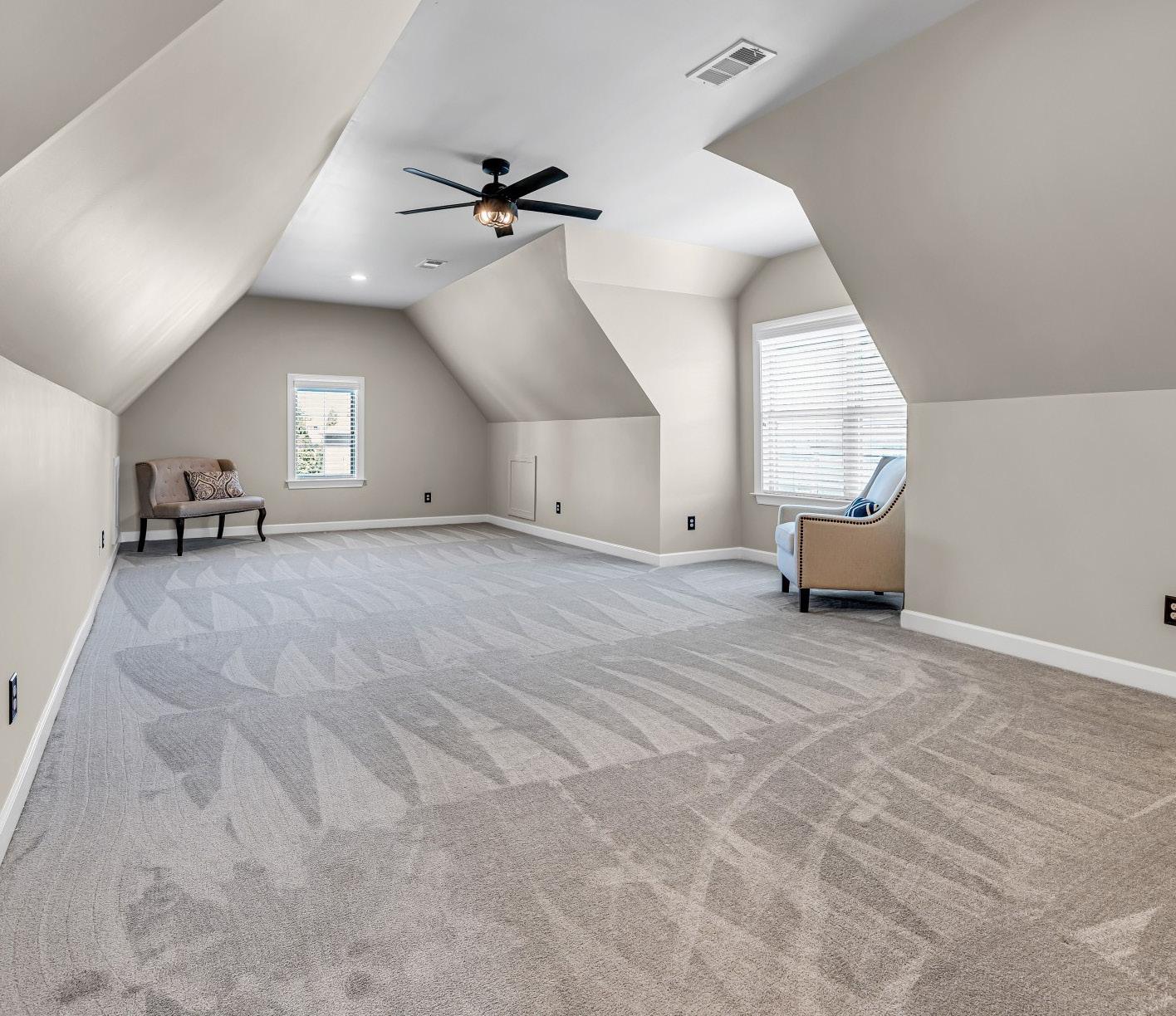 Upper Level Bonus Room with a Vaulted Ceiling, Recessed Lighting, Ceiling Fan, and 2” Blinds