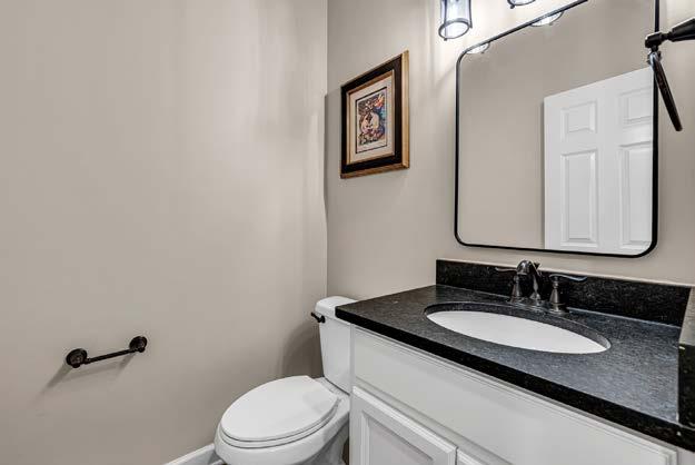 The Powder Room features a leathered granite top vanity, an oil-rubbed bronze faucet, a framed mirror, and hardwood flooring.