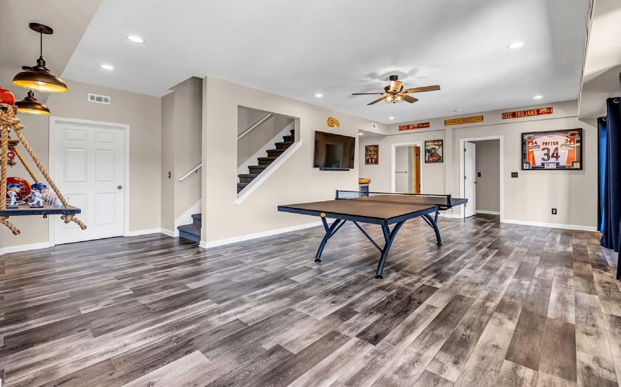 Basement Bonus Room with Wide Plank Flooring, Unique Accent Rope Shelf, Recessed Lighting, and Access to Covered Patio and Pool Area