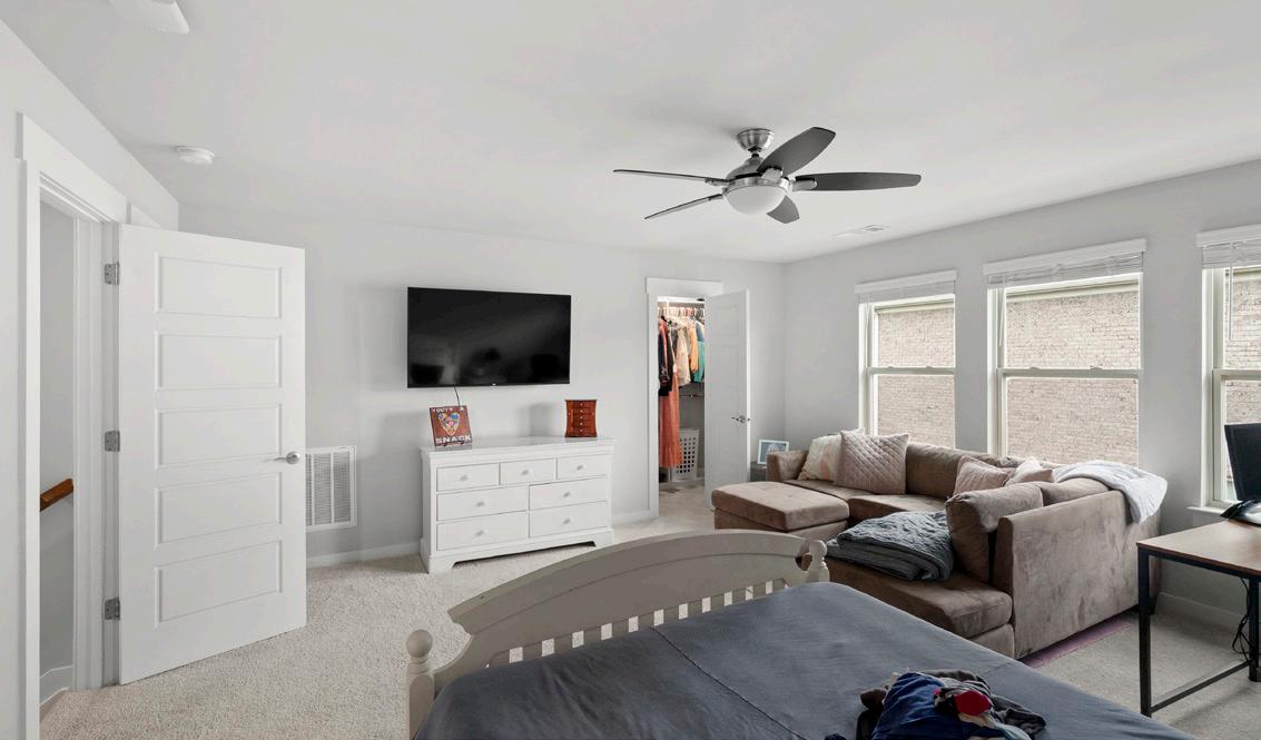 The staircase offers attractive iron basket and twist spindles that lead to a versatile bonus room. This expansive space offers the flexibility to serve as an additional bedroom, complete with windows and blinds overlooking the side yard for natural light and privacy. Comfort is ensured with a ceiling fan and soft carpet underfoot, and a TV mount is already in place for your future TV and entertainment.